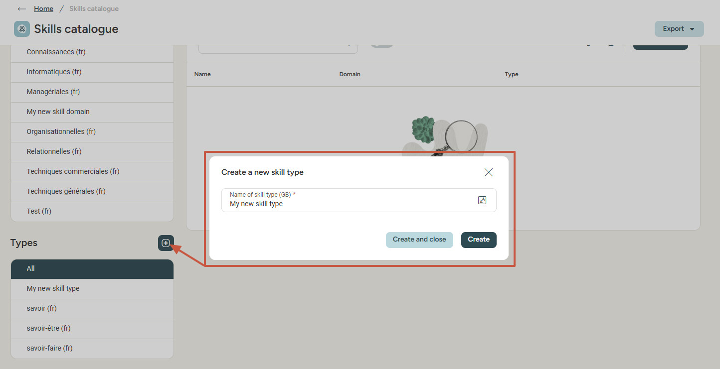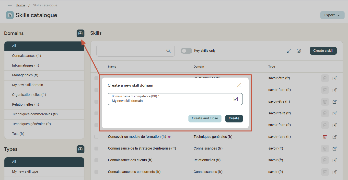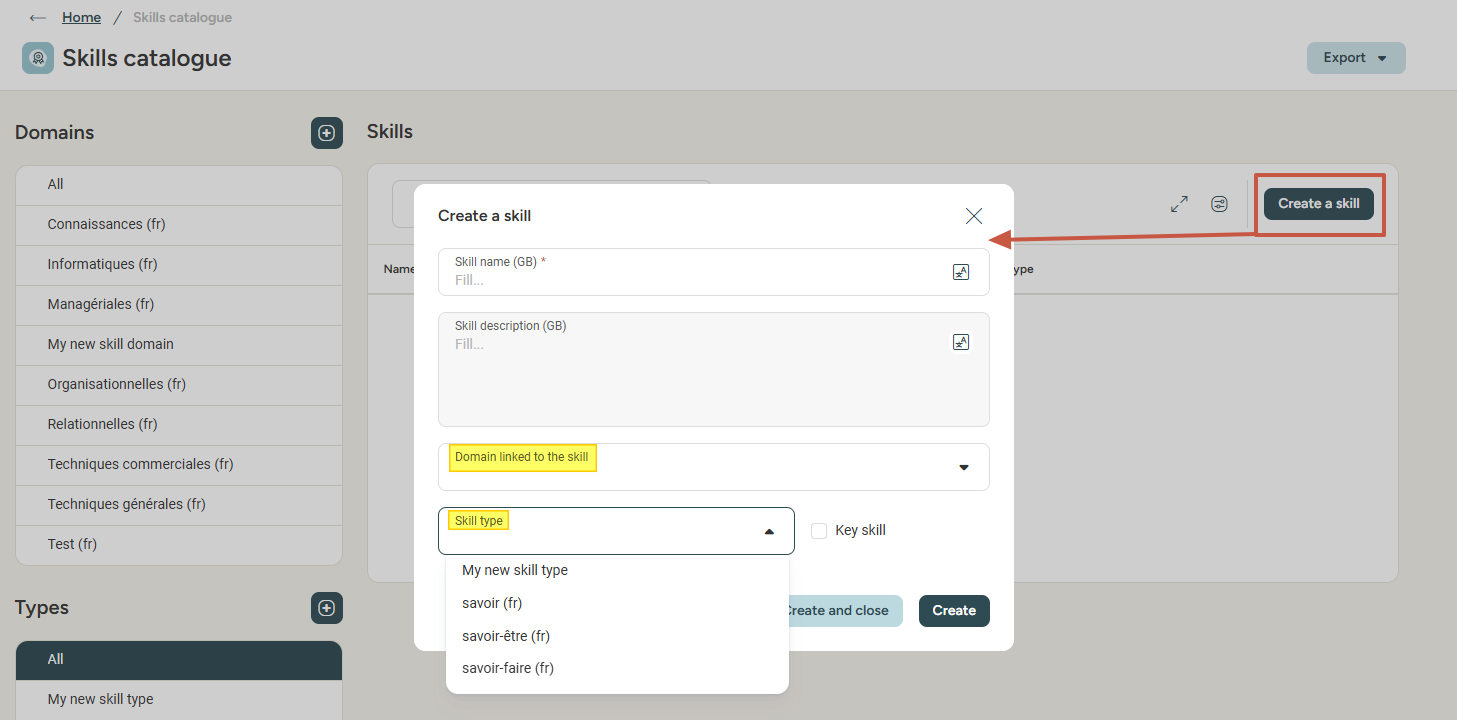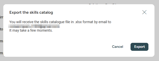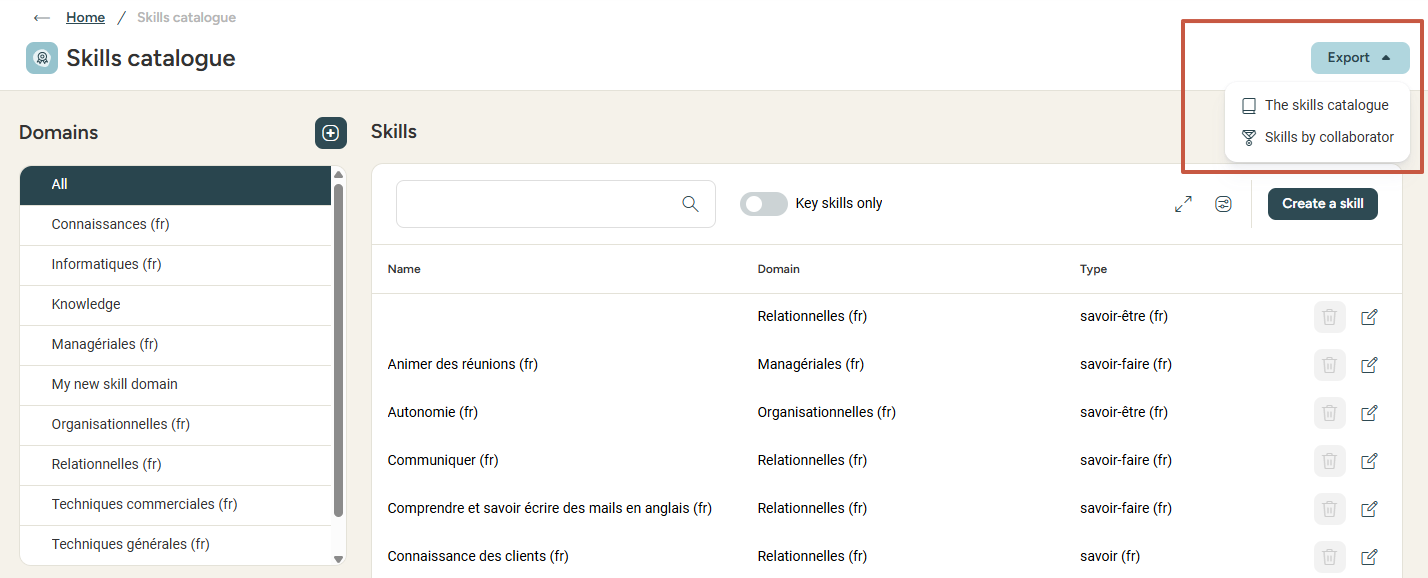 To easily update my skills catalogue, I can download the current catalogue by clicking on 'Export' and then on 'Skills catalogue':