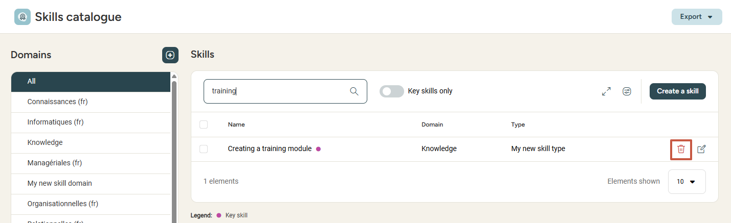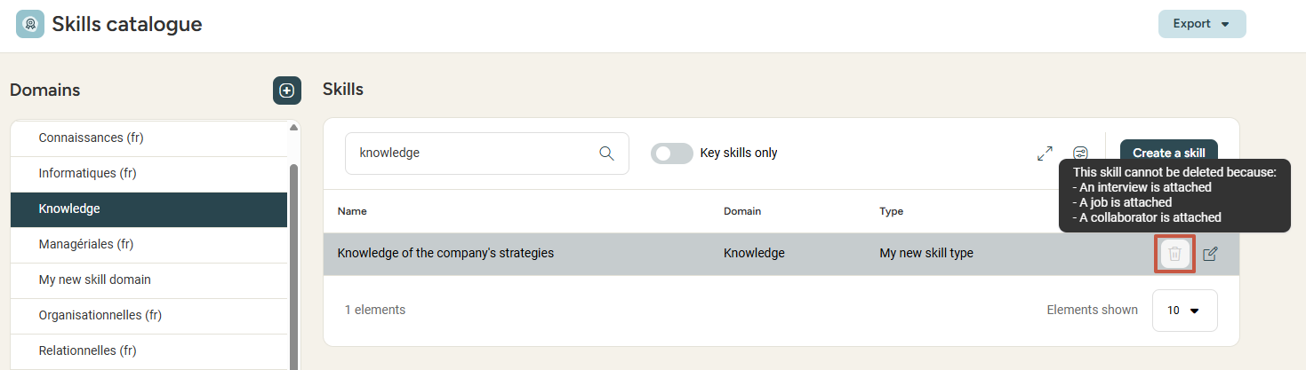 If the skill cannot be deleted, the trash can icon will be grey and the reason will be shown in a pop-up.