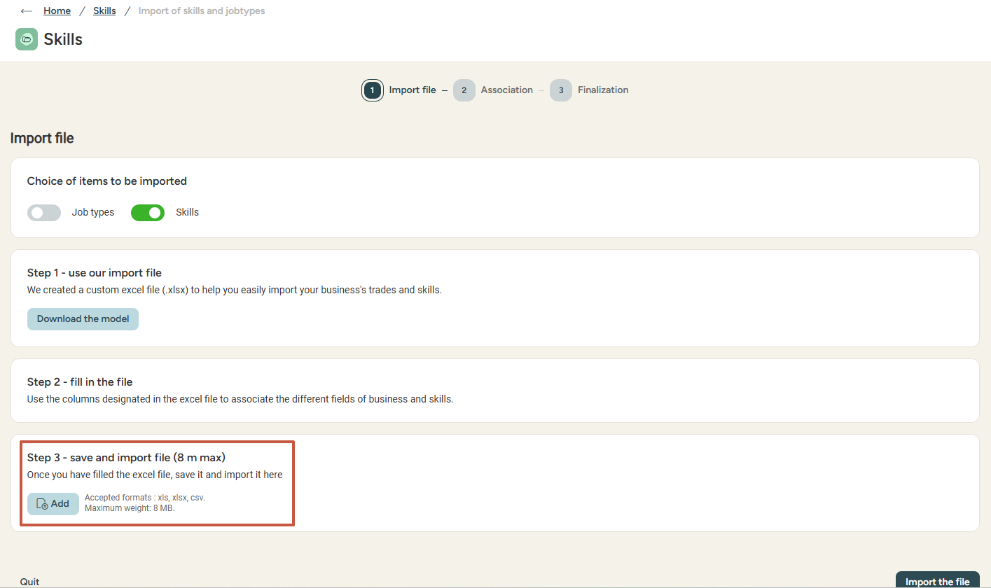 The modified file must be in xls, xlsx or csv format. Its size must not exceed 8MB.
