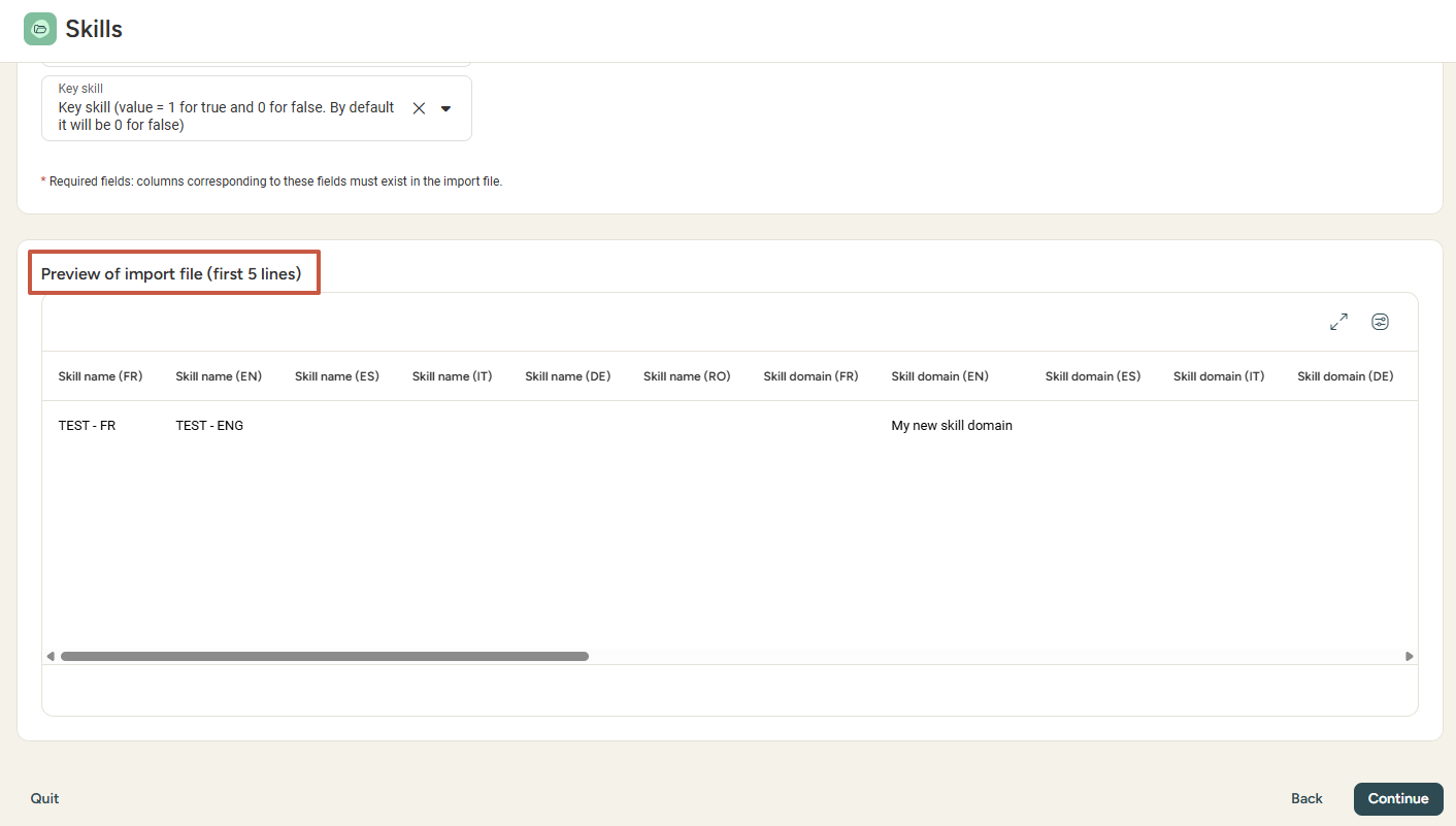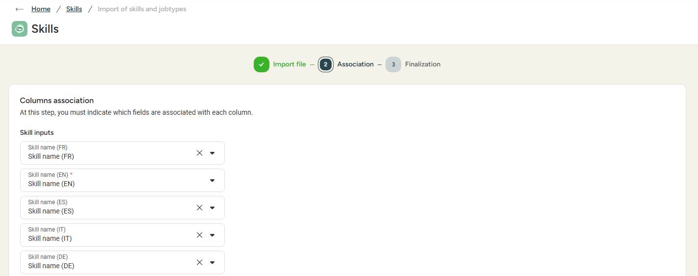 - Skill Code : This must be unique to each skill. It is automatically generated by Eurécia and identifies your skills so they can be updated. If a skill already exists with the same code, it will be updated upon import.