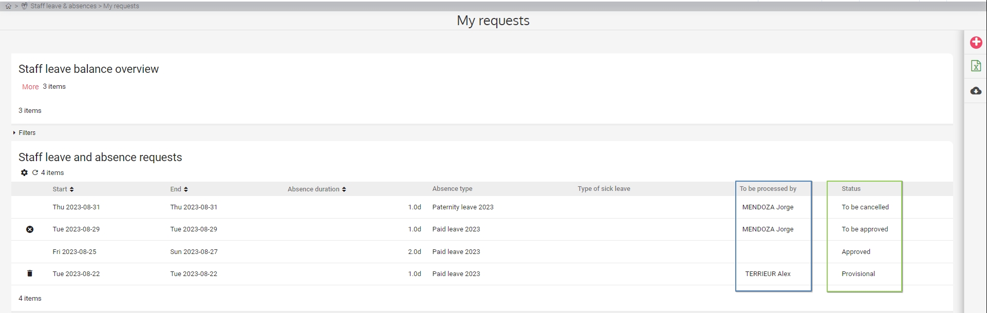 Below the synthesis tab, you can find the Staff leave and absence requests tab. This is where you can find the list of every request made and its status.