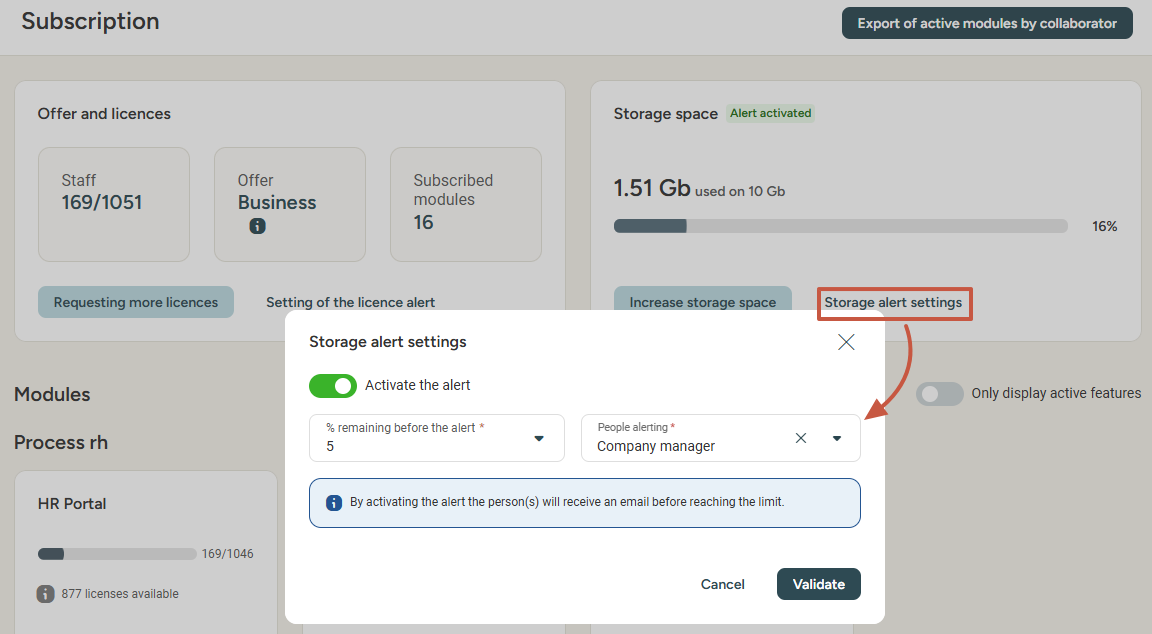 🔔 You have the option to configure an alert to be notified when the remaining storage space reaches the defined limit: