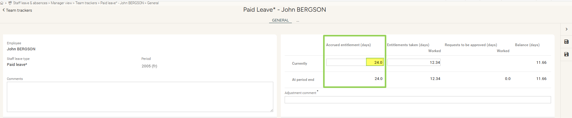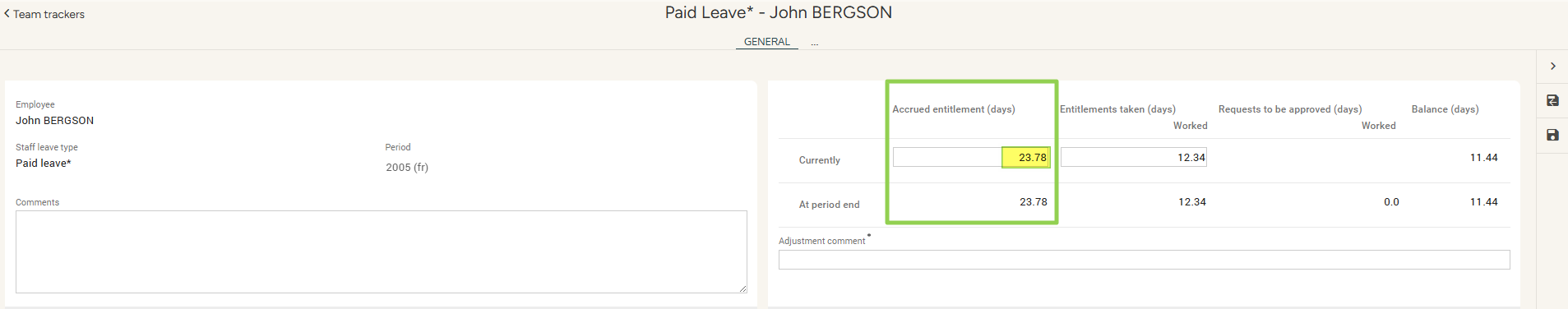 This operation allows you to enter a number of acquired days or hours in the tracker, regardless of any previous actions and without taking into account the leave already taken. It affects the acquired entitlements, not the tracker balance.