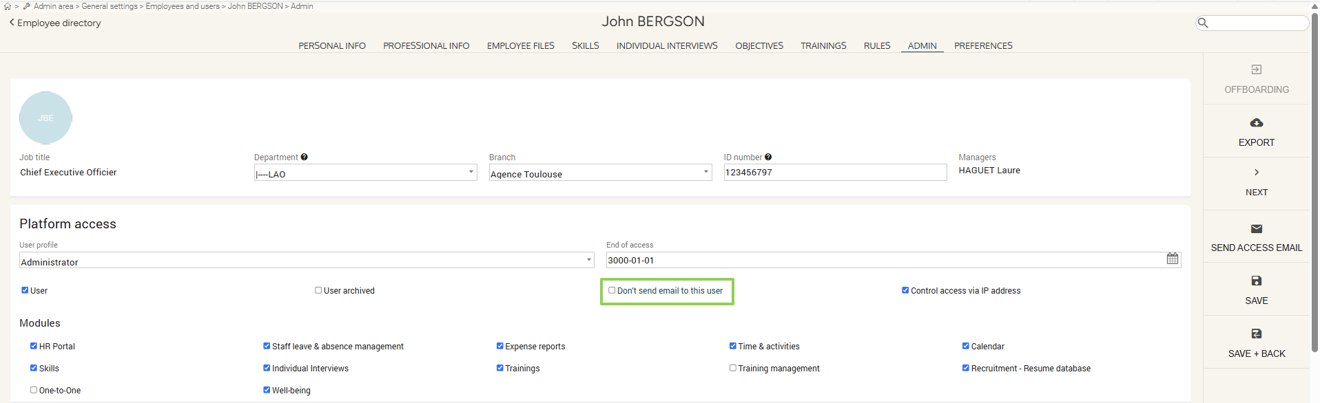 By checking this box, all emails sent by Eurécia are disabled. Your employee will no longer receive any emails. |