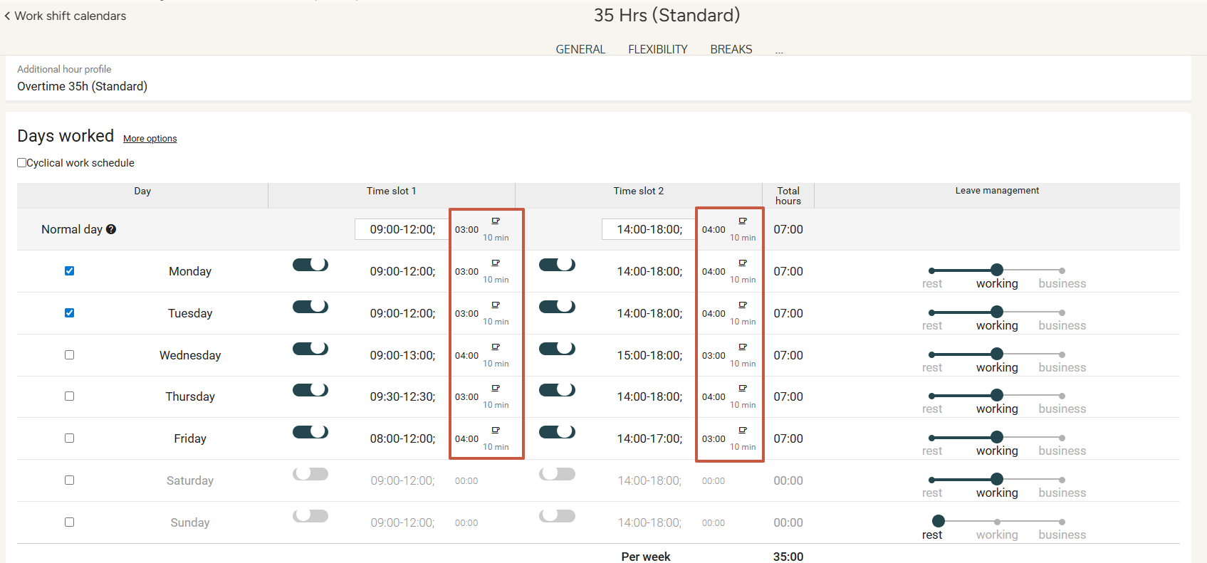 Example: Jeremy works 35 hours per week, but his breaks are not included in this working time. He has a debit/credit time-off system based on a fixed 35-hour workweek. This week, he recorded 35 hours and 30 minutes on his timesheet, including a 45-minute break.