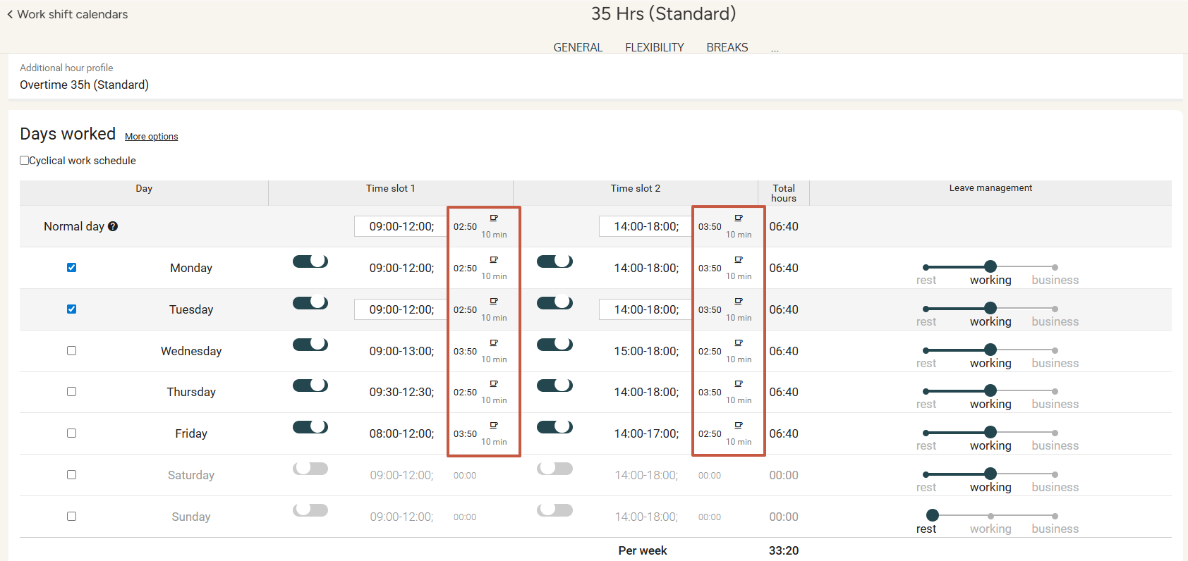 - Breaks considered as worked and included in overtime: break times are considered as working time and are included in the calculation of overtime.