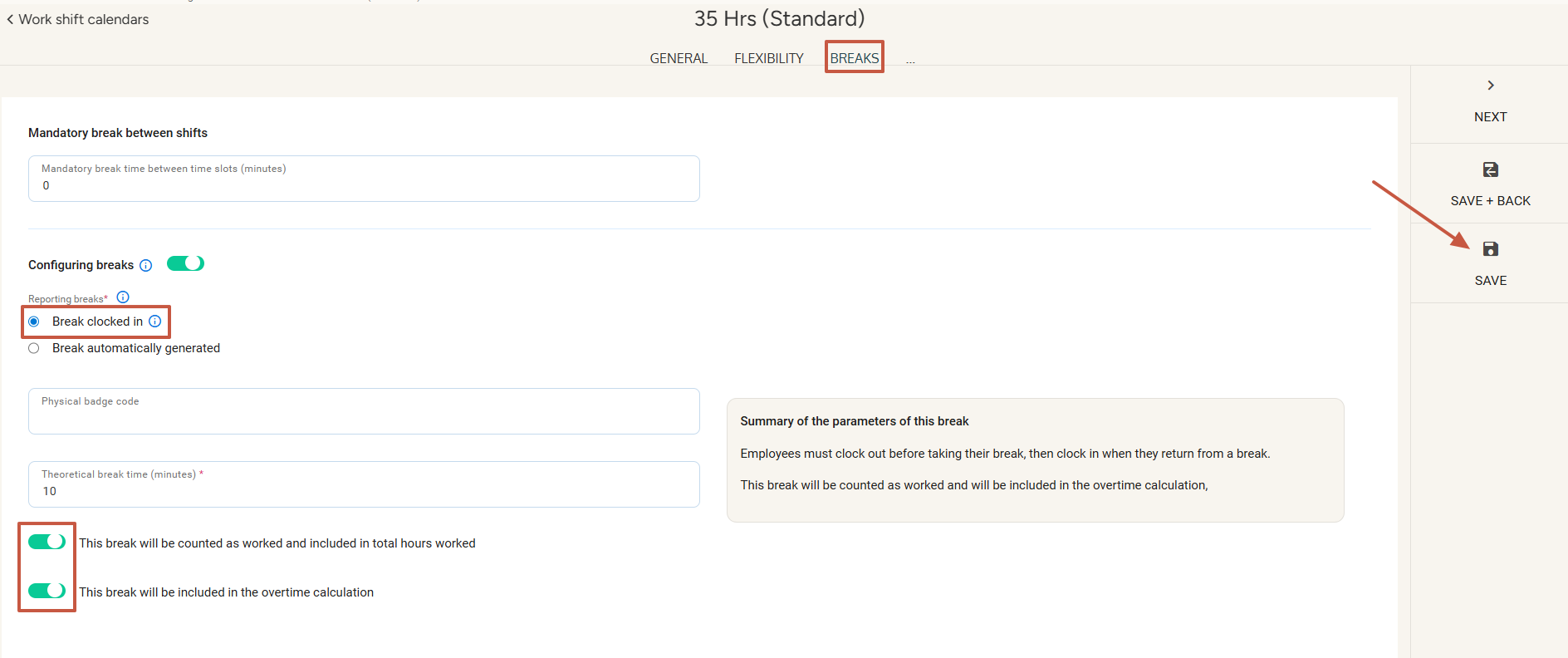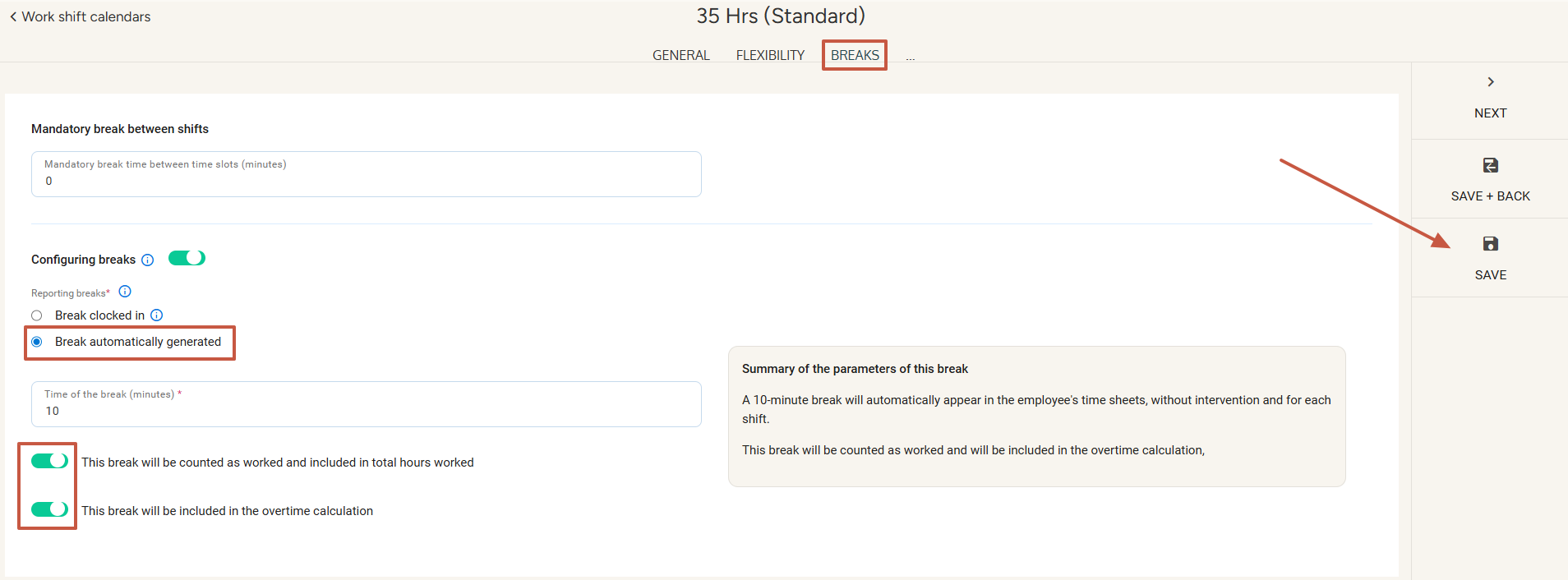 - If my break should be counted as worked and included in the total hours worked, I can activate the "This break will be counted as worked and included in the total of hours worked" button.