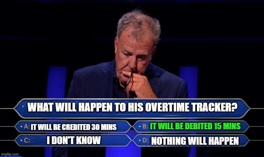 Yes, Jeremy didn't declare enough actual working time. He declared 35 hours and 30 minutes, including a 45-minute break. Therefore, only 34 hours and 45 minutes are considered as worked. Since he is theoretically required to work 35 hours, 15 minutes will be deducted from his overtime tracker.