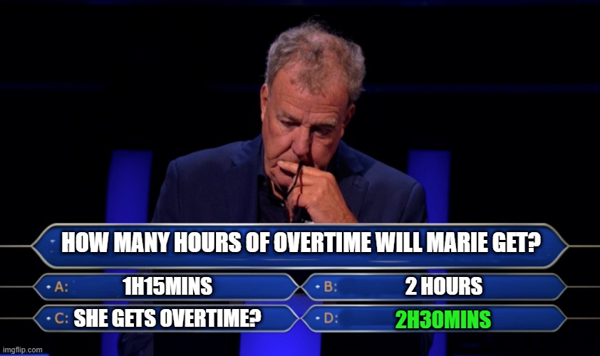 Example: Marie works 39 hours per week. Any hours worked beyond 39 are paid at a rate of 125%. This week she worked 41 hours, including a 45-minute break.