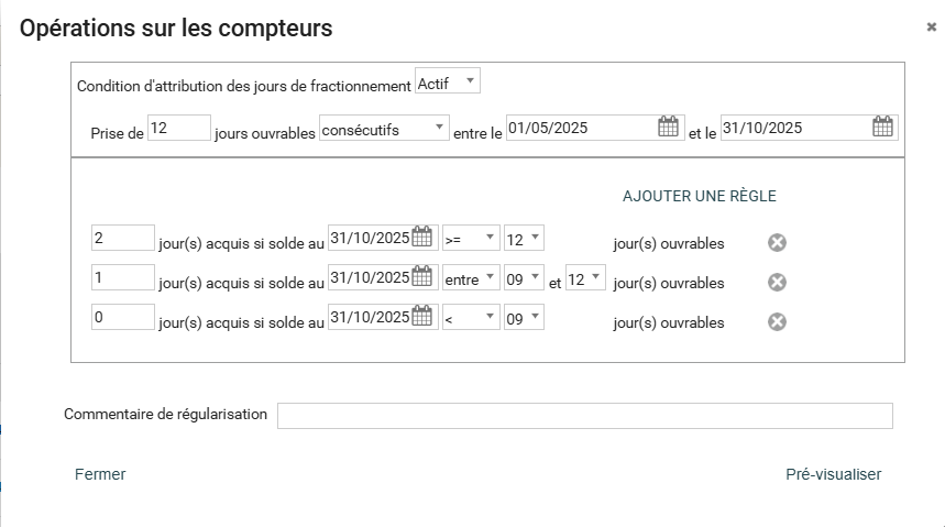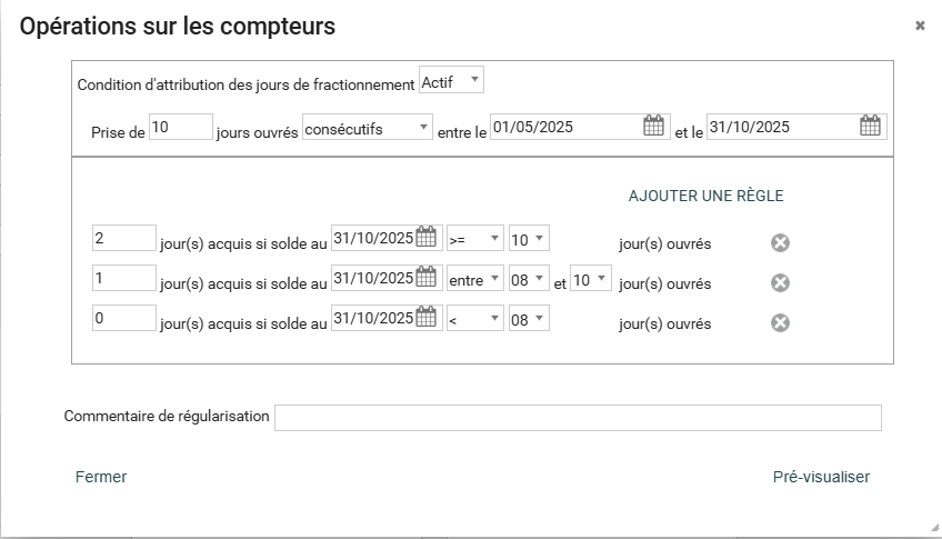 Je définis les règles d'attribution des jours de fractionnement en ajoutant une ou plusieurs règles. Par exemple :