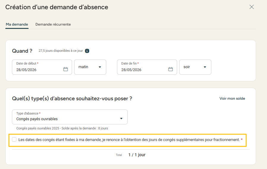 Dans le type d'absence, je viens cocher la case "Renonciation au fractionnement" afin que les collaborateurs indiquent renoncer à l'obtention des jours de fractionnement.
