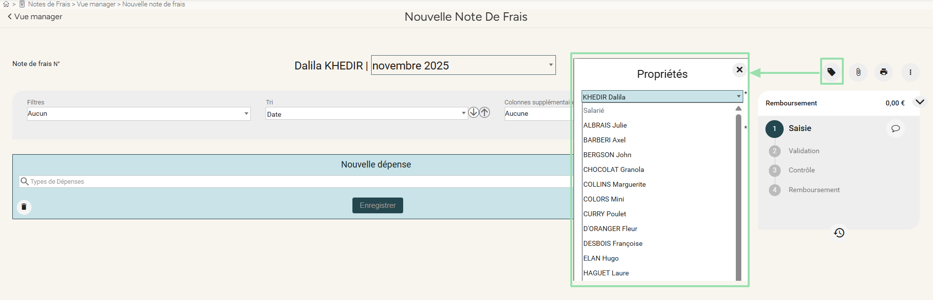 S'il n'est pas possible de sélectionner un autre salarié dans les propriétés de la note de frais, l'administrateur Eurécia peut contacter le service d'assistance pour activer les autorisations sur un ou plusieurs profils utilisateurs. |