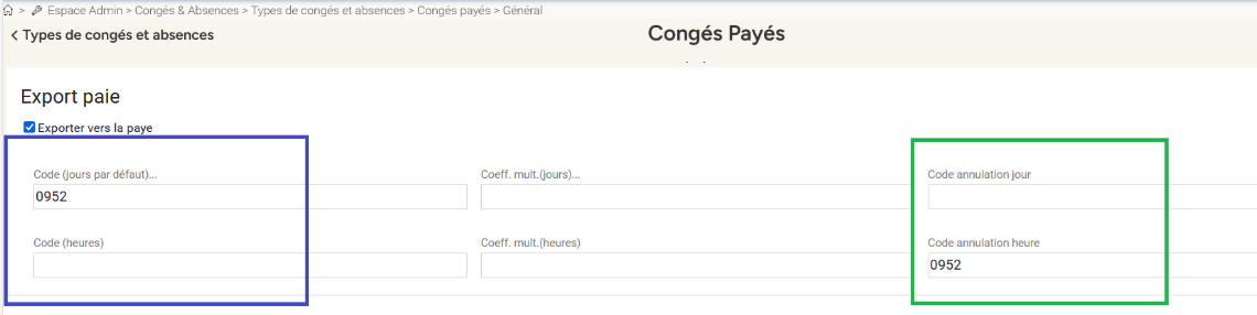 Le code paie exporté et l'unité d'export (heures ou jours) dépendent des champs "code annulation heure" et "code annulation jour". (encart en vers ci-dessous).