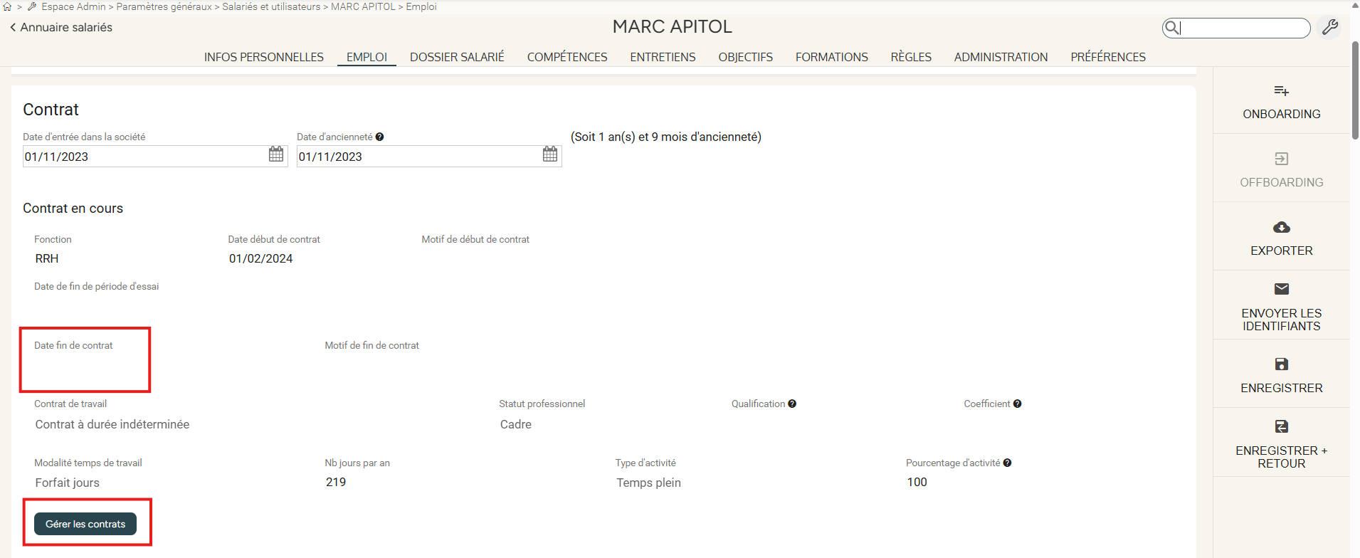 Accès : Espace Admin > Fiche Salariés et Utilisateurs > onglet Emploi > rubrique Contrat