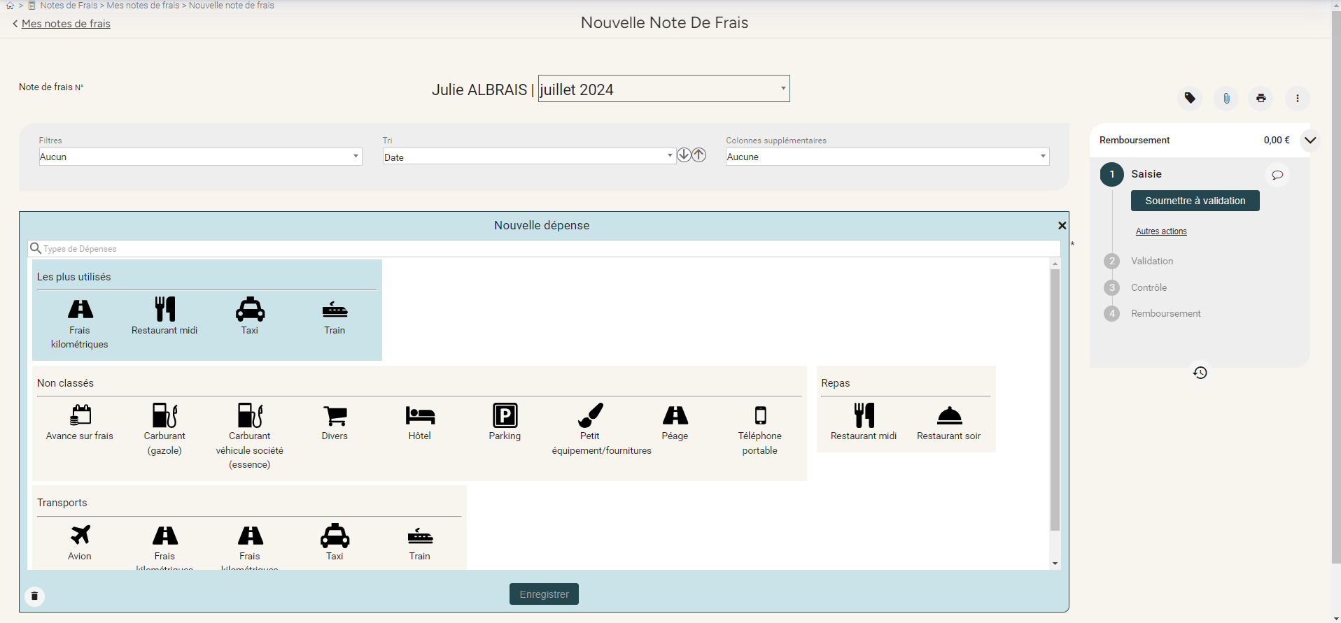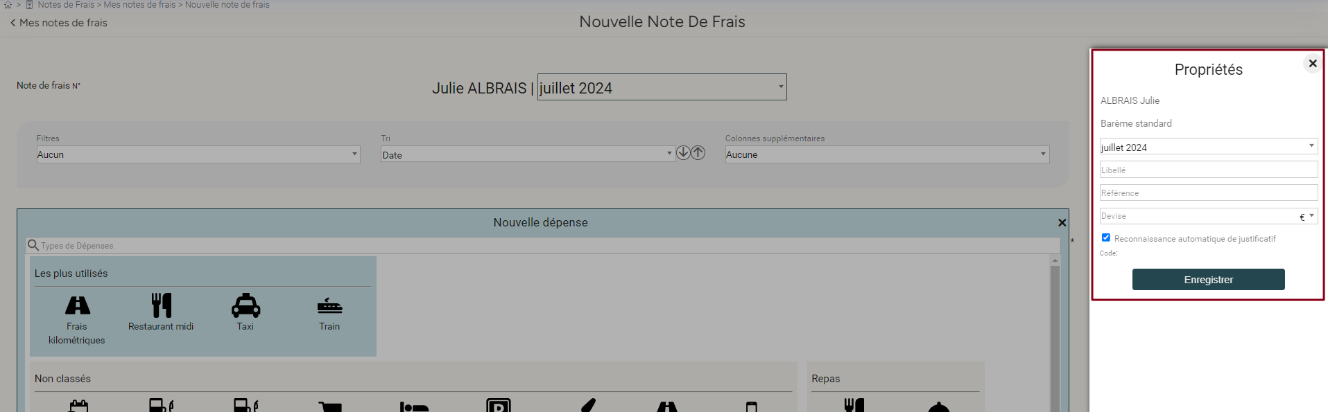 La partie gauche de l'écran permet d'ajouter différentes dépenses, et le bandeau de droite permet de modifier les paramètres de la note de frais.