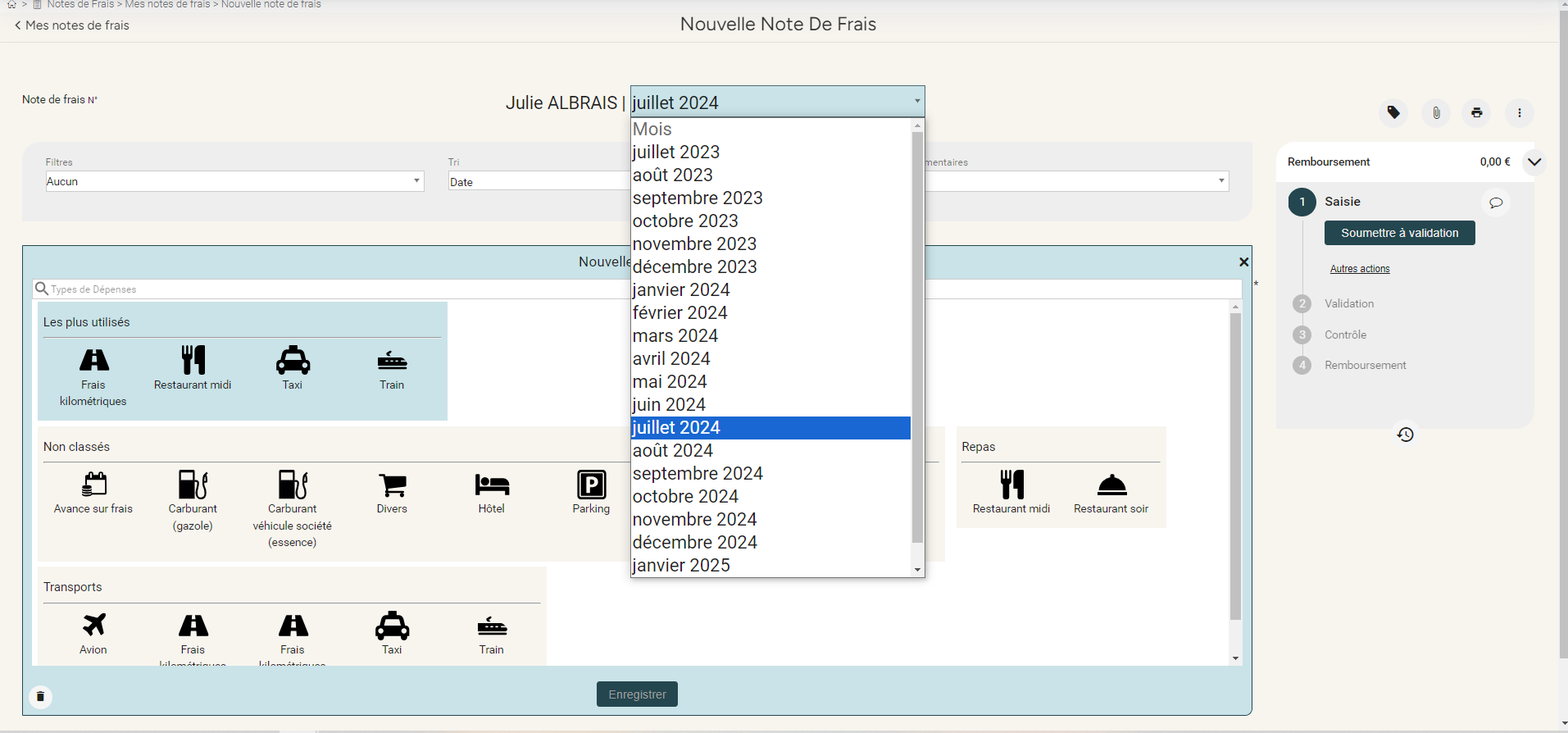Je peux modifier très simplement la période de ma note de frais en cliquant sur le mois à côté de mon nom :