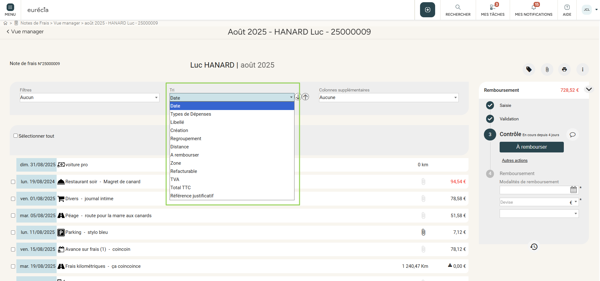 Pour une meilleure lisibilité, Eurécia permet, dans chaque note de frais, d'organiser et classer les dépenses en fonction de certains critères.