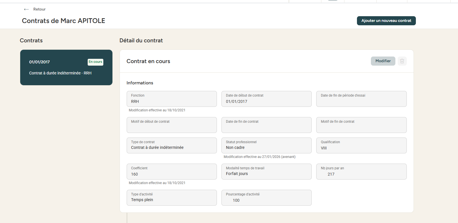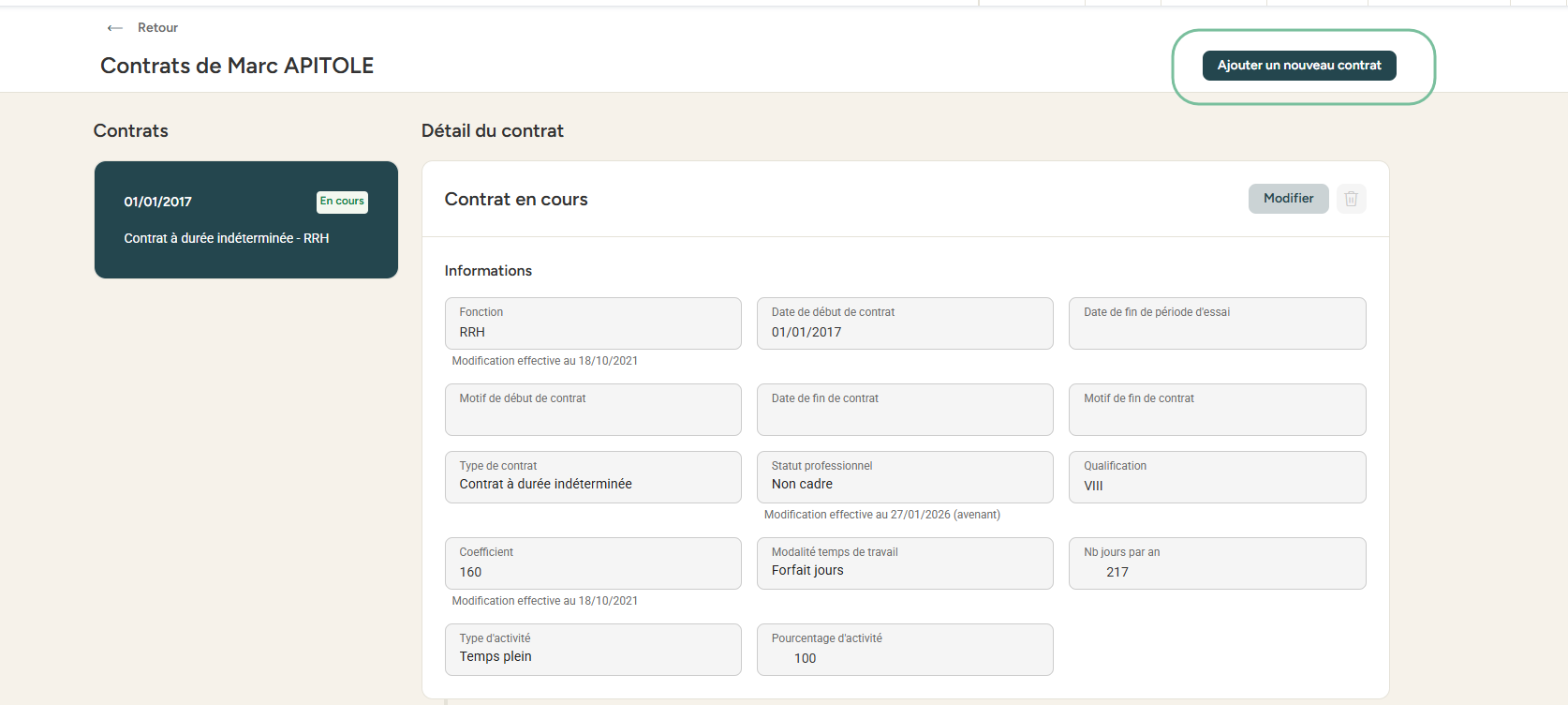 Accès : Espace admin > Salariés & Utilisateurs > Fiche salarié > Onglet Emploi > Gérer les contrats
