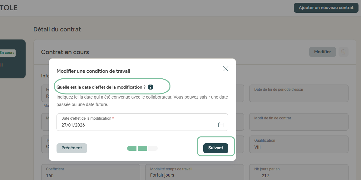 Sélectionnez l’encart « Modifier une condition de travail », puis cliquez sur Suivant.