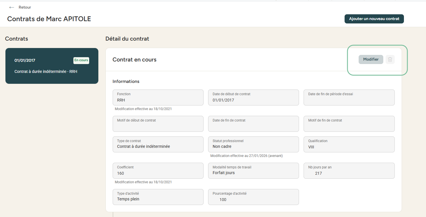 👉 Commencez par sélectionner le contrat en cours, puis cliquez sur Modifier pour accéder aux options.