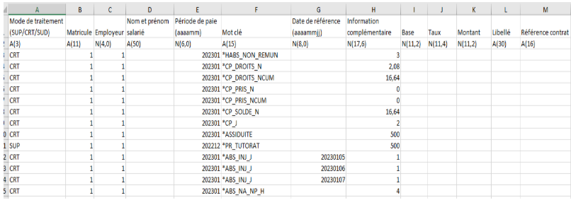 | 7 | Date de référence (aaaammjj) | N(8,0) | A alimenter uniquement pour les absences (1 ligne par jour d’absence) |