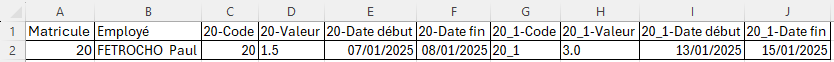 Matricule;Employé;20-Code;20-Valeur;20-Date début;20-Date fin;20_1-Code;20_1-Valeur;20_1-Date début;20_1-Date fin