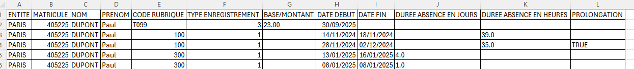 Remarque : Si pour un même salarié, il existe plusieurs absences de même type (même code paie) , un indice (_n) sera ajouté à la suite du code paie de l’absence.