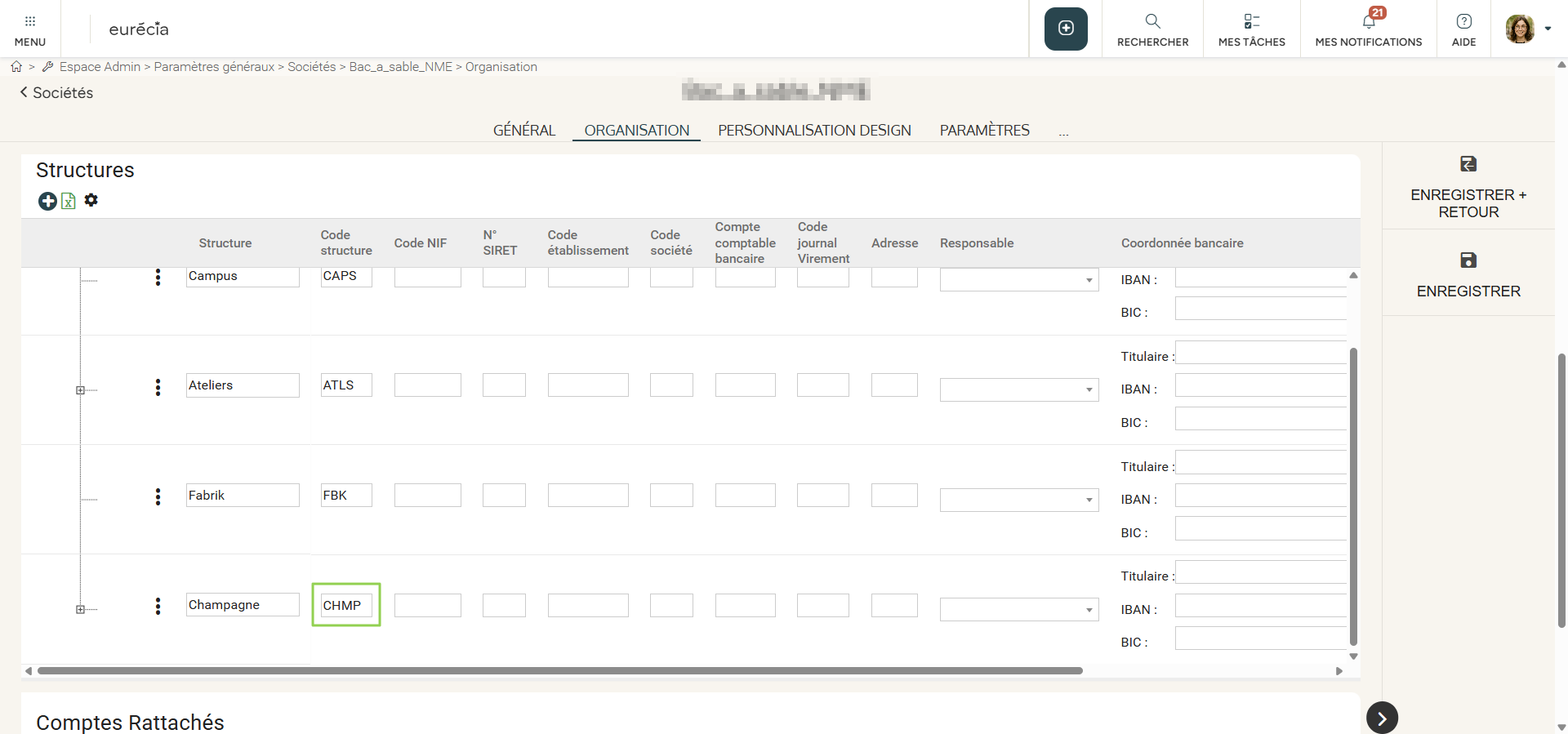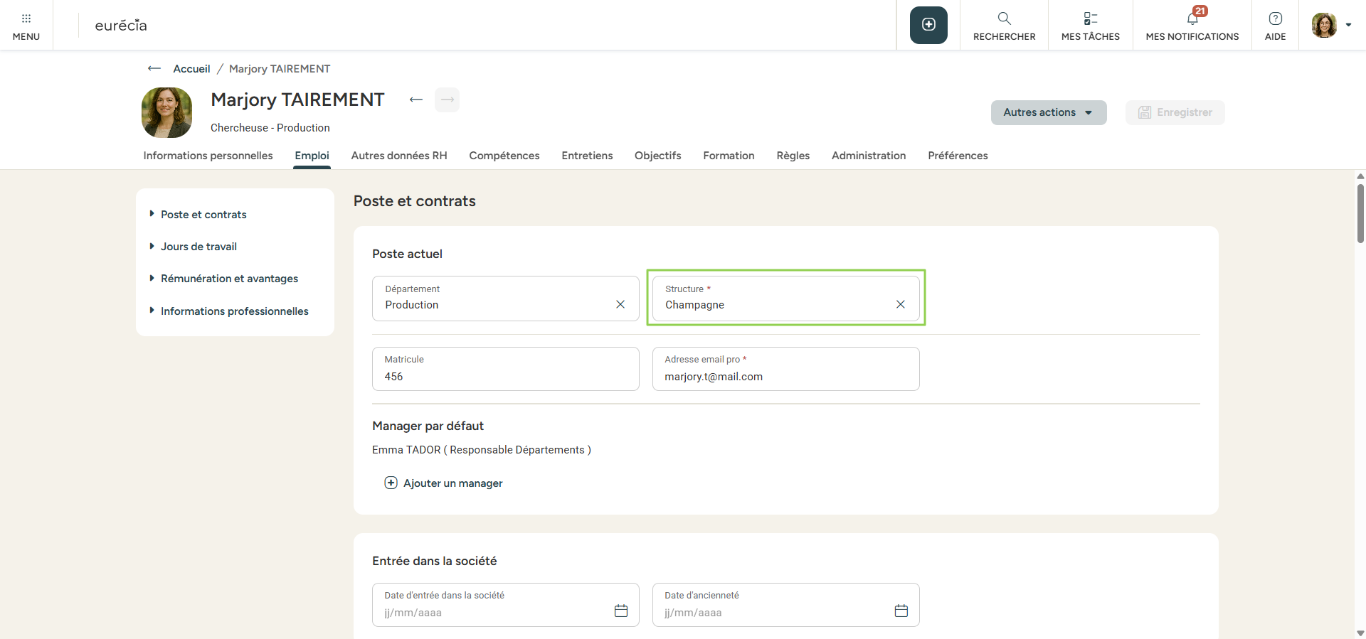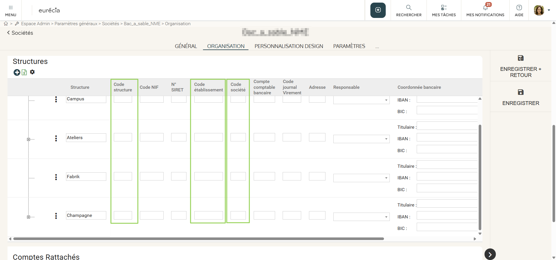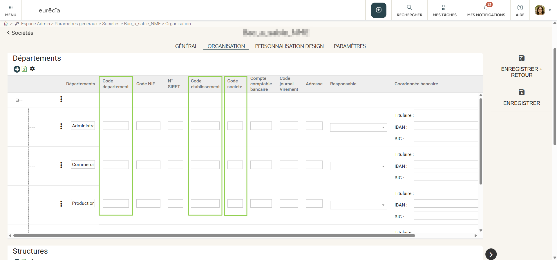 Cet élément devra ensuite être renseigné dans votre fiche société côté Eurécia. Vous pourrez l'indiquer soit au niveau de l'encart Département, soit au niveau de l'encart Structures.