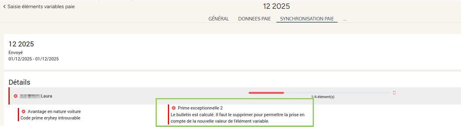 « Le bulletin est calculé. Il faut le supprimer pour permettre la prise en compte de la nouvelle valeur de l'élément variable »