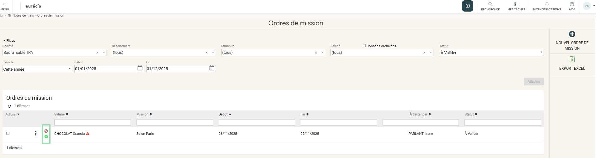 Tout à droite de chaque ligne, deux boutons permettent de valider ou refuser l’ordre de mission.