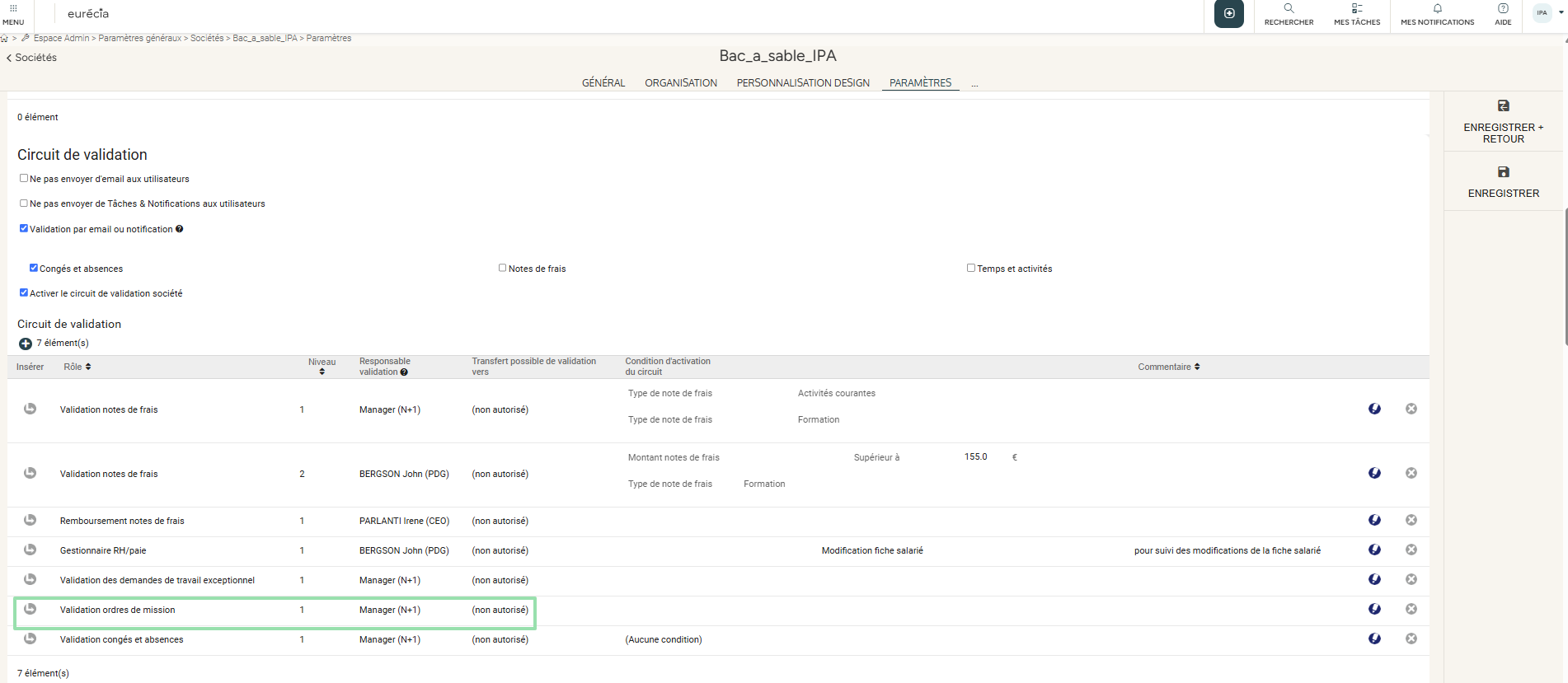 Paramétrer le circuit de validation des ordres de mission : fiche société