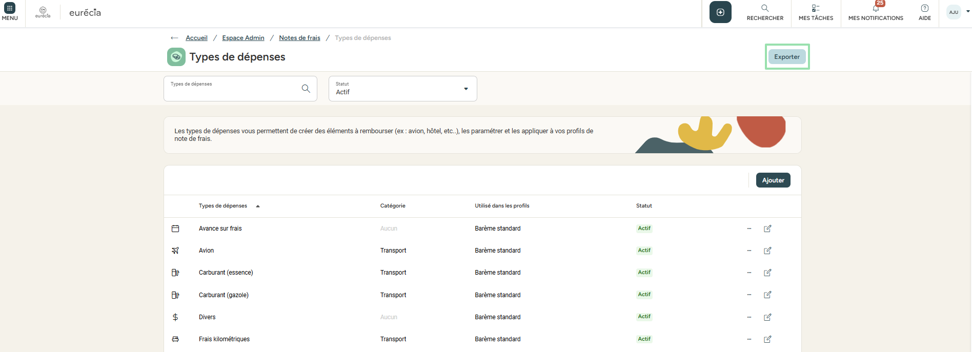 Accès : Nouvel Espace Admin > Notes de frais > Types de dépenses