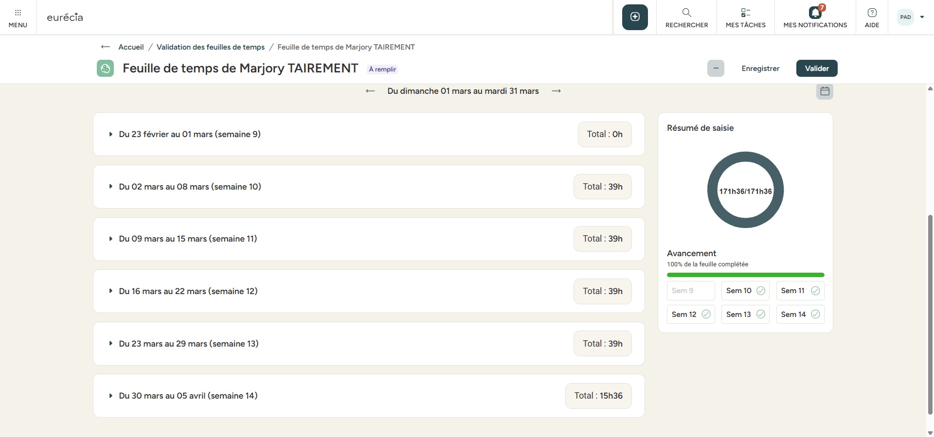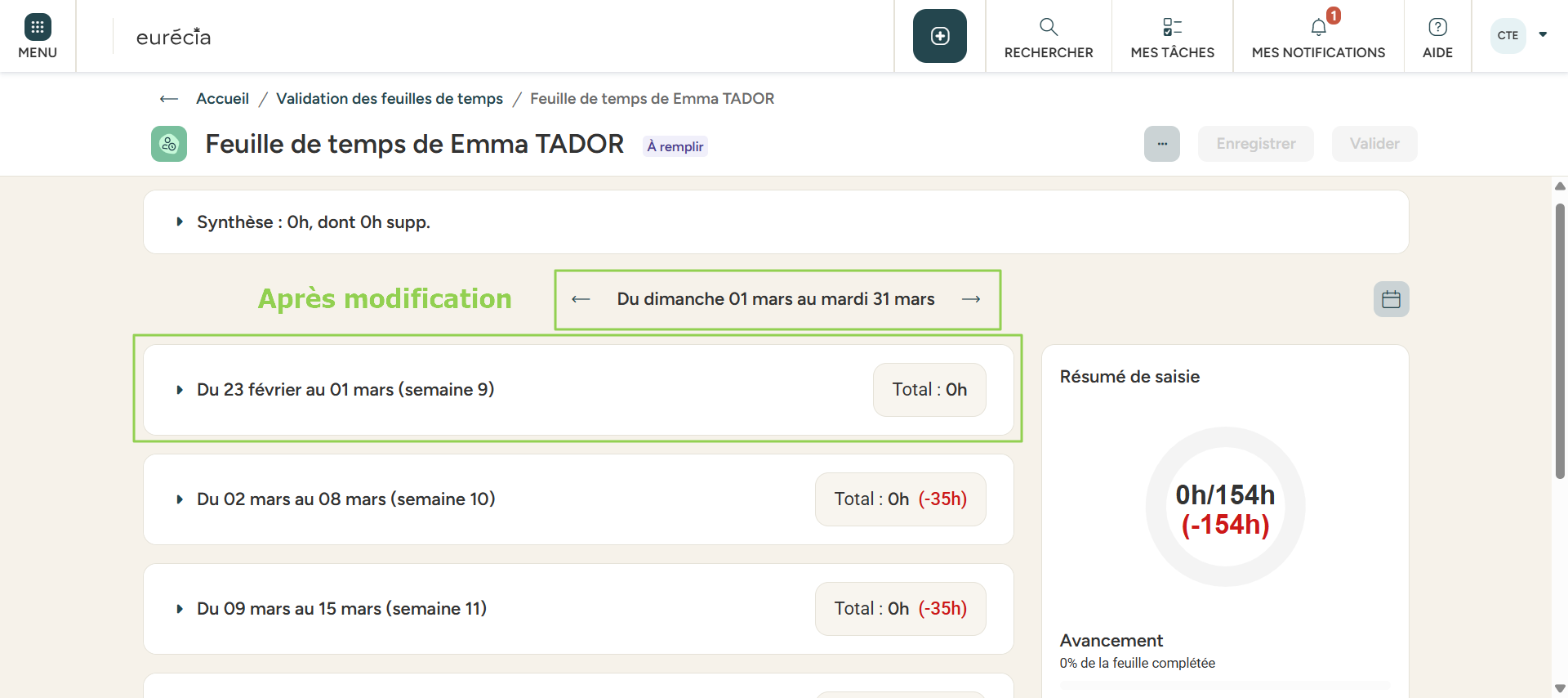 Prenons un exemple : Nous sommes le 20 février, je modifie la périodicité des feuilles de temps de Emma en les passant de Hebdomadaires > Mensuelles. Alors la première feuille de temps impactée est celle du 1er mars au 31 mars et commence donc un dimanche :