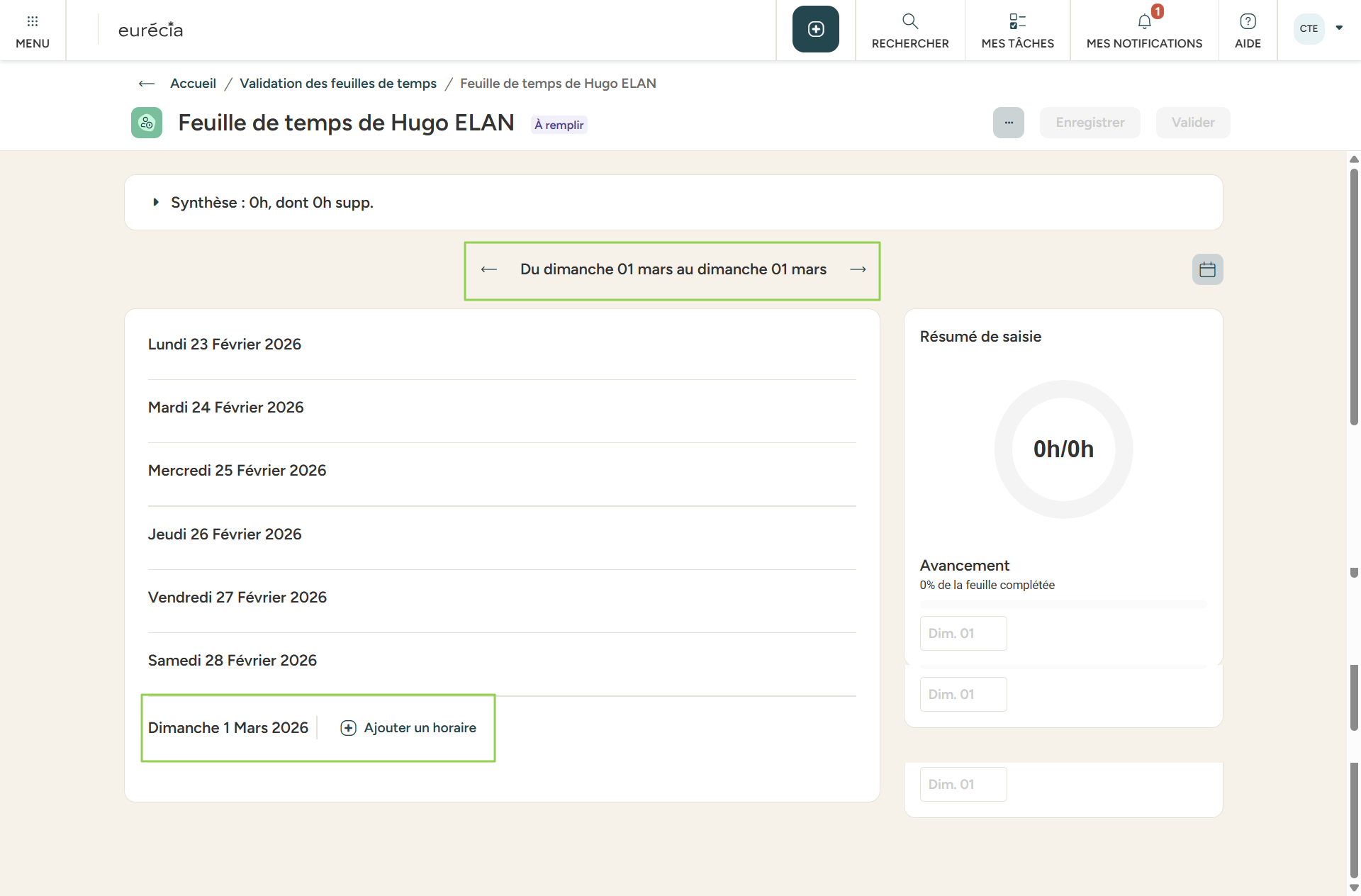 A l'inverse, je modifie la périodicité des feuilles de temps de Hugo pour les passer de Mensuelles > Hebdomadaires. La première feuille de temps sera celle du 1er mars et ne compte que le dimanche :
