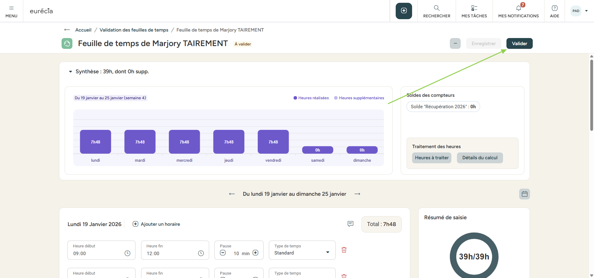 Dans la liste des feuilles de temps, en fin de chaque lignes, cliquer sur le logo 'Valider'.