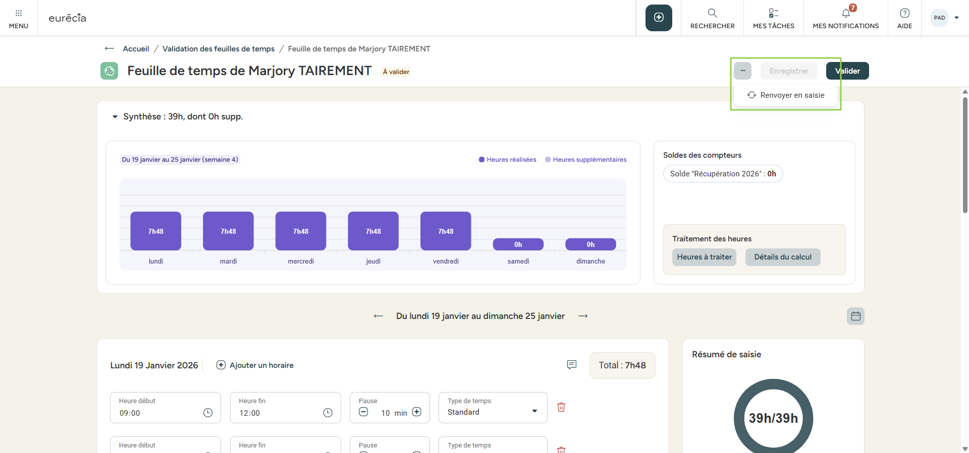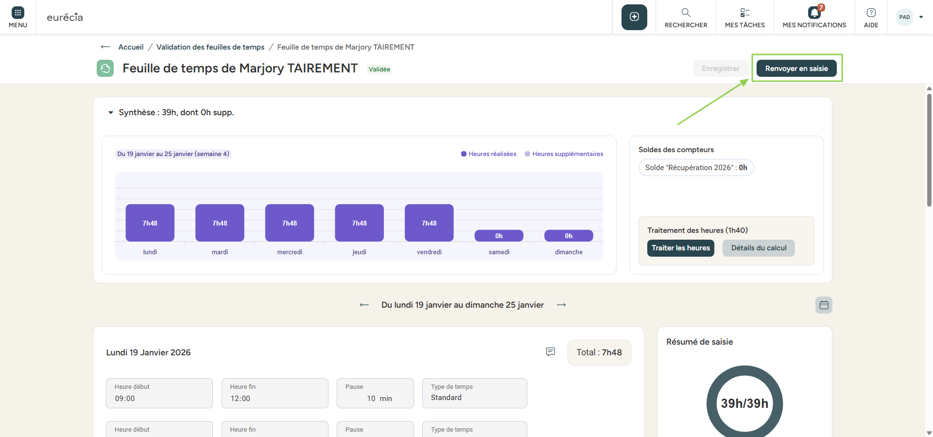 Si la feuille nécessite une correction de la part du salarié cliquer sur 'Renvoyer en saisie'.