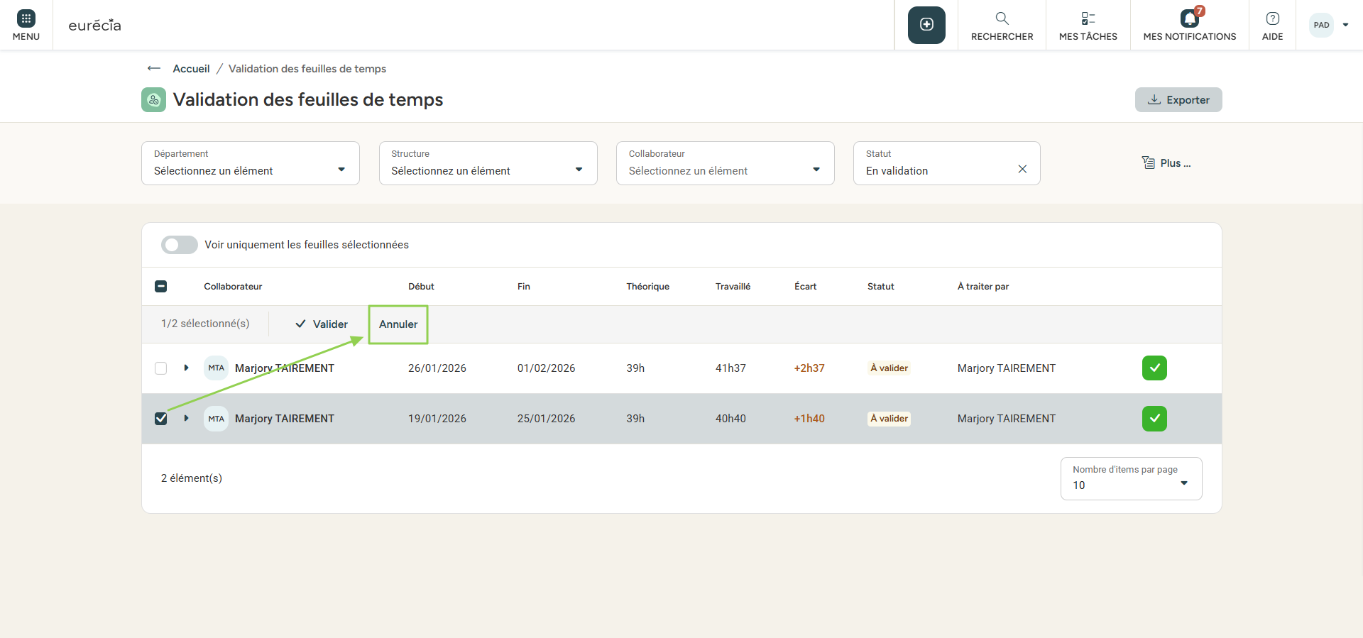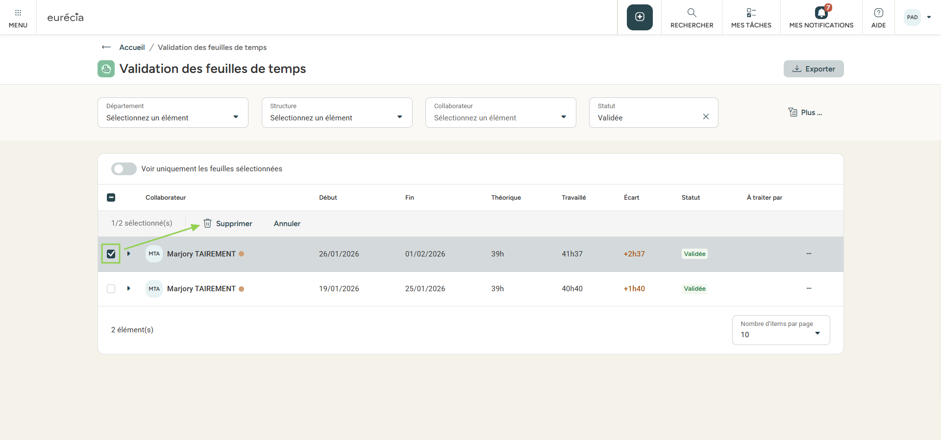 Pour valider plusieurs feuilles de temps en une seule action, sélectionnez les feuille de temps puis choisissez 'Valider' :