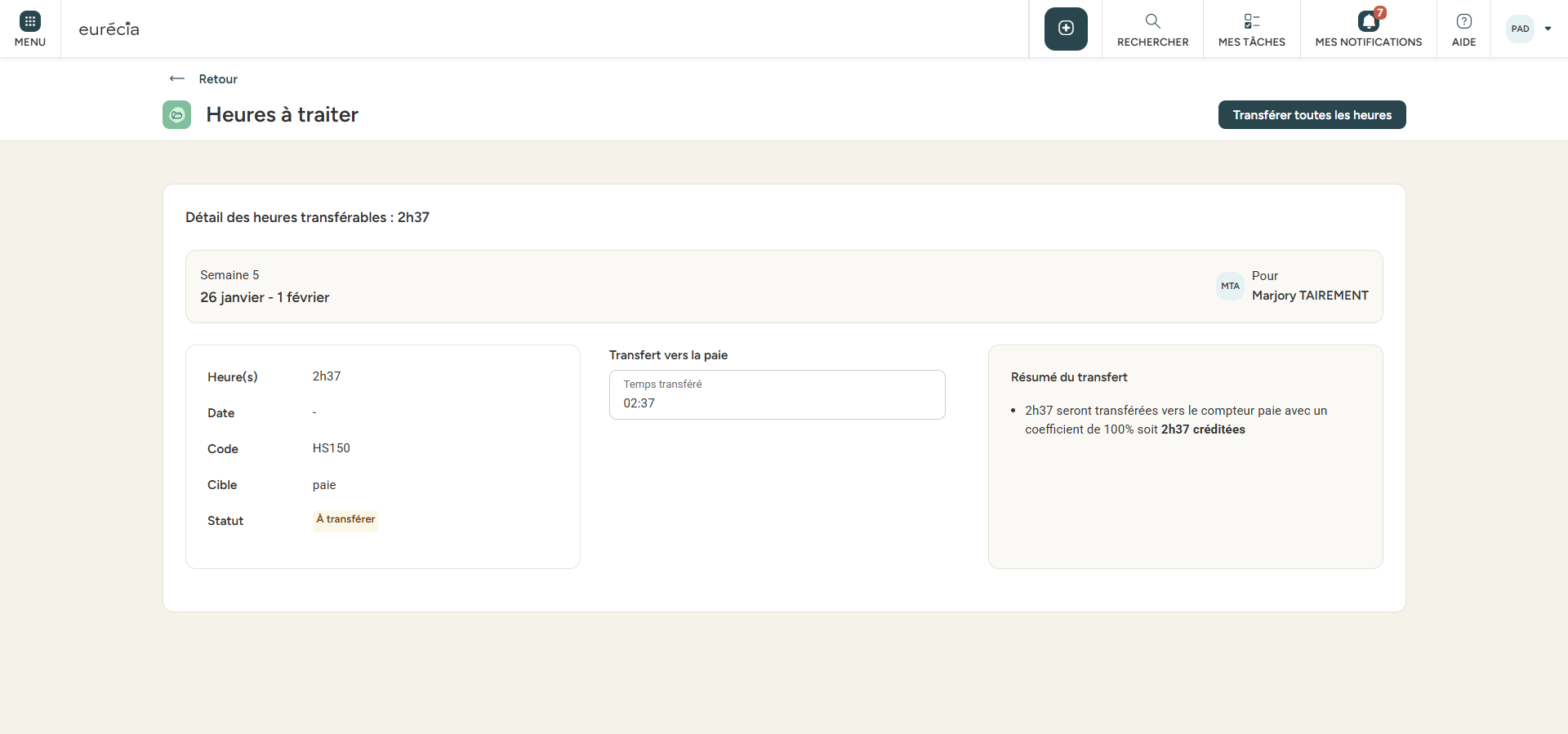 Si le paramétrage des règles d'heures supplémentaires de votre société prévoit un transfert manuel, alors ce transfert pourra être effectué directement depuis la feuille de temps du collaborateur :