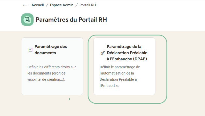 Depuis votre nouvel espace administrateur, cliquez sur Portail RH, puis sur Paramétrage de la DPAE.