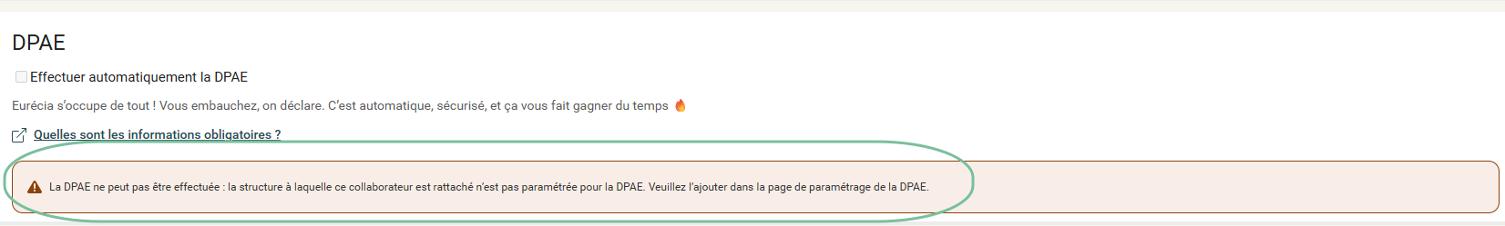 Attention ! Attention : il est indispensable d’attribuer à votre collaborateur une structure que vous aurez préalablement renseignée dans le paramétrage de votre DPAE (étape 1). 😉 Sans cela, vous risquez de voir apparaître ce type de message : |