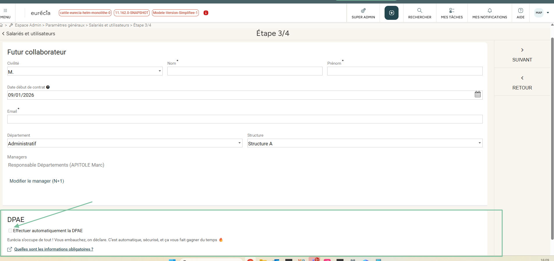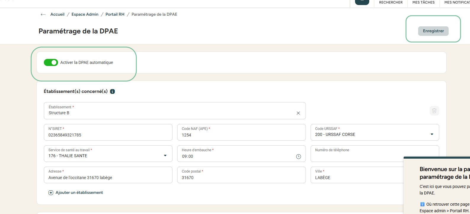 - La case DPAE est cochée mais l'envoi automatique serait dans -5 jours (déjà passé)