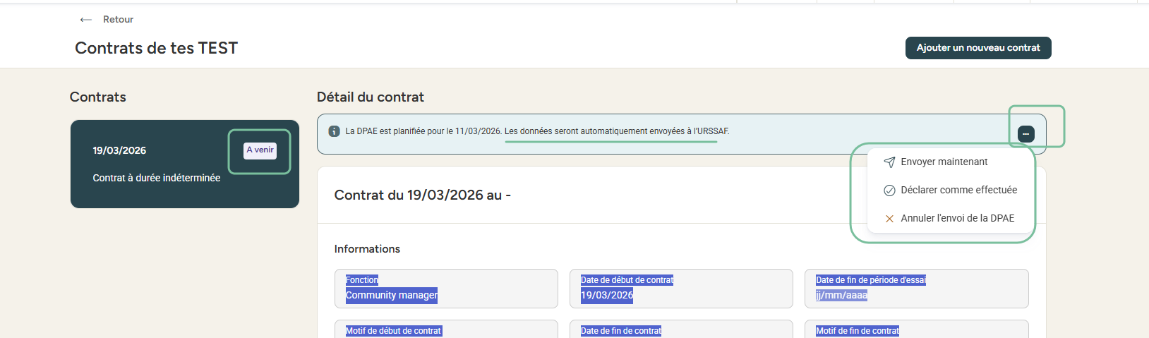 - Voir le statut actuel de la DPAE (planifiée, envoyée, en erreur, effectuée)