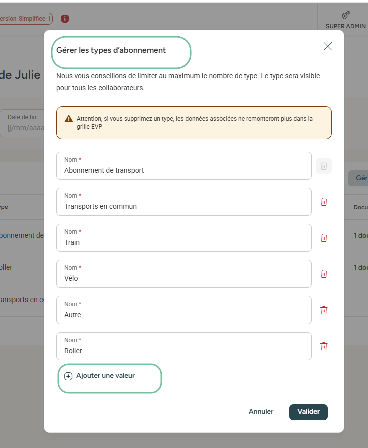 Vous pouvez créer de nouveaux types d'abonnements transports pour l'ensemble de vos collaborateurs directement depuis la fiche de l'un d'entre eux en cliquant sur 'Gérer les abonnements de transports'.