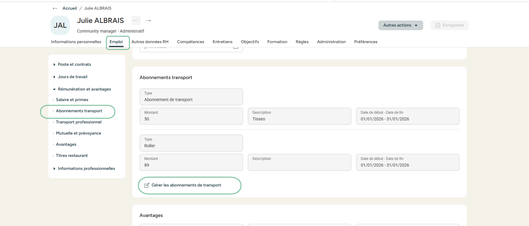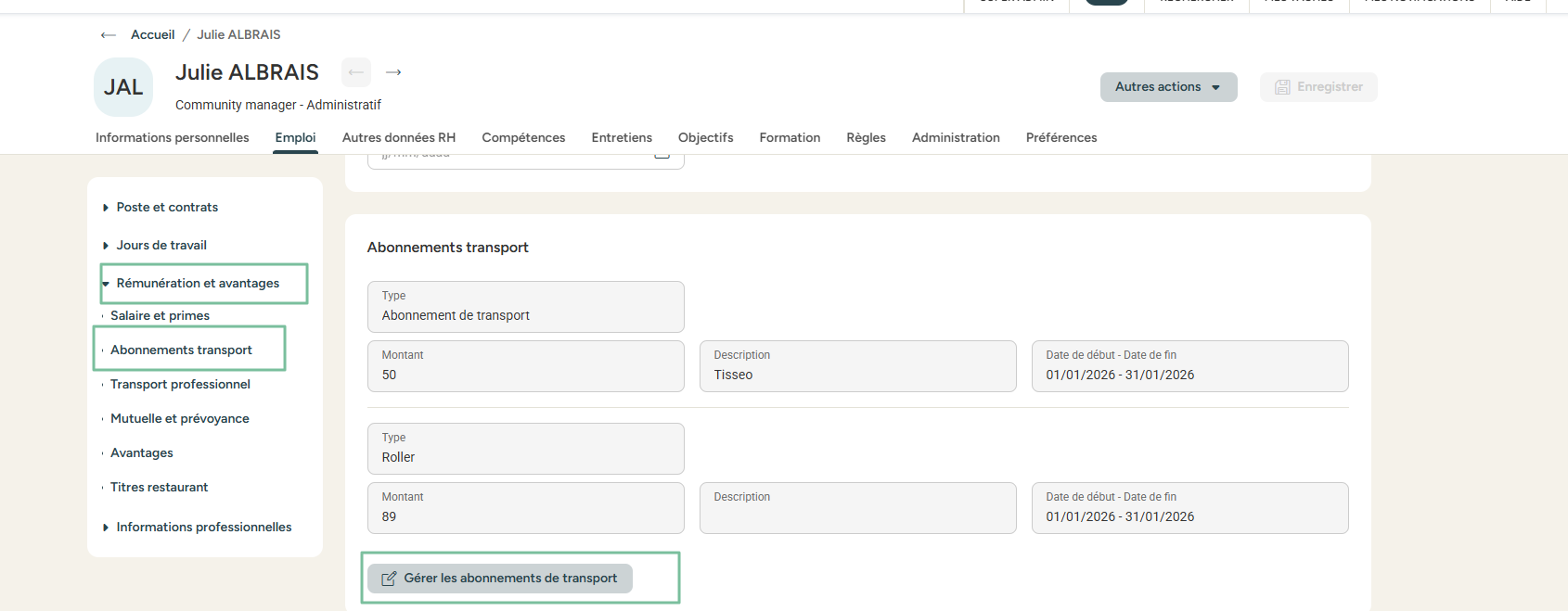 Avec la fonctionnalité Abonnements de transport, tout se passe désormais directement dans la fiche collaborateur, onglet emploi : plus clair, plus pratique, et surtout mieux organisé.