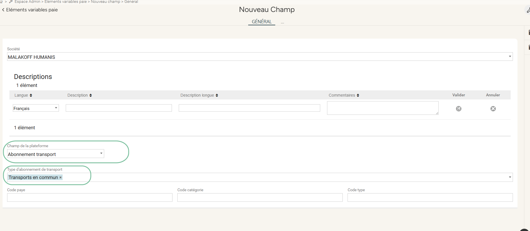A noter ! Vous pouvez directement modifier votre champ existant pour plus de simplicité en remplaçant 'Autres données RH (Dossier salarié)' par 'Abonnement transport' dans la liste 'Champ de la plateforme'. |