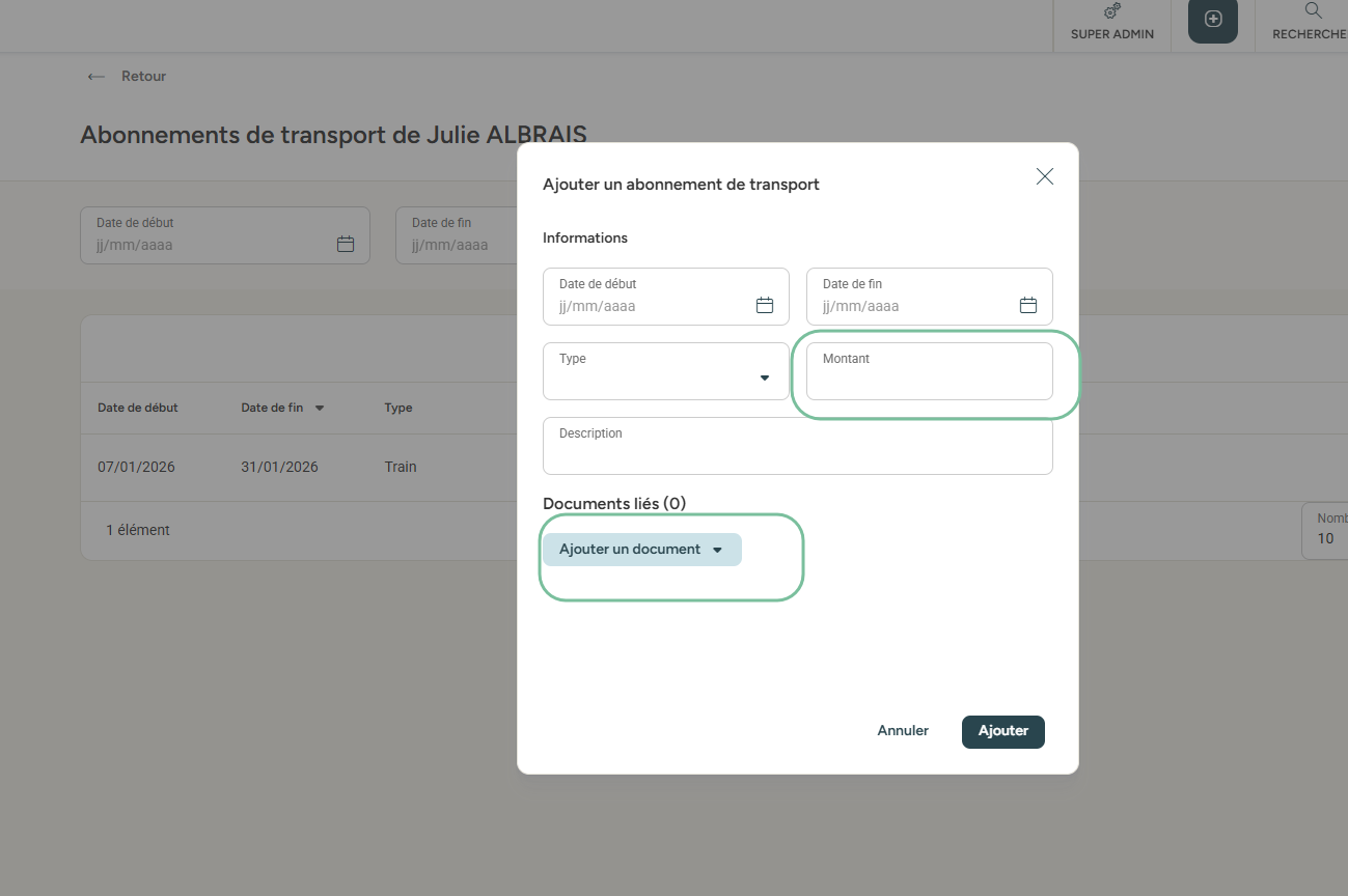 Les abonnements de transport se gèrent directement depuis la fiche collaborateur. Quelques clics suffisent pour ajouter un nouvel abonnement et y associer les justificatifs nécessaires. 📄