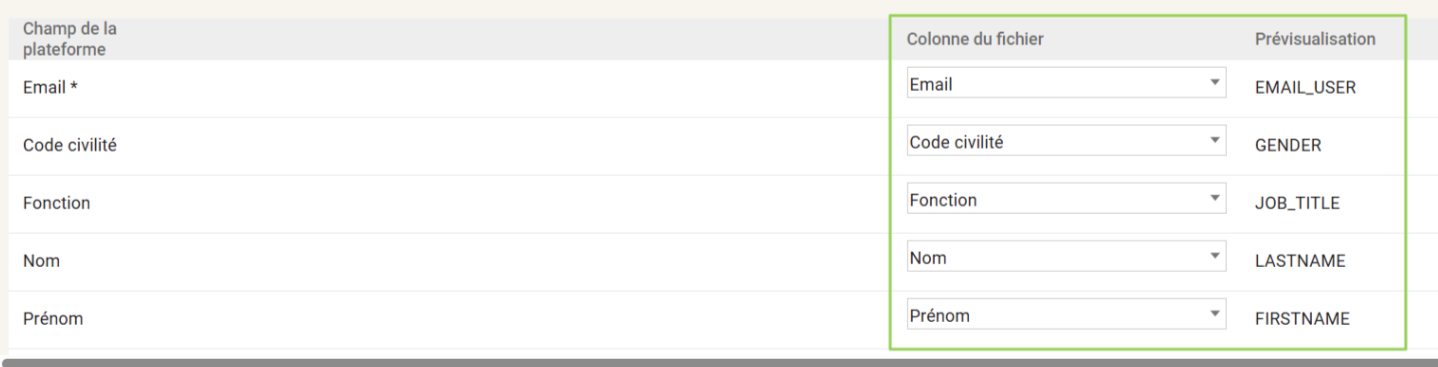 Une fois votre fichier chargé, il faut procéder à l'association des champs Eurécia aux noms de vos colonnes sur excel.