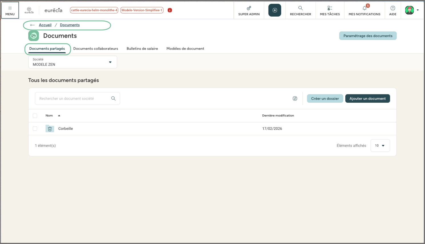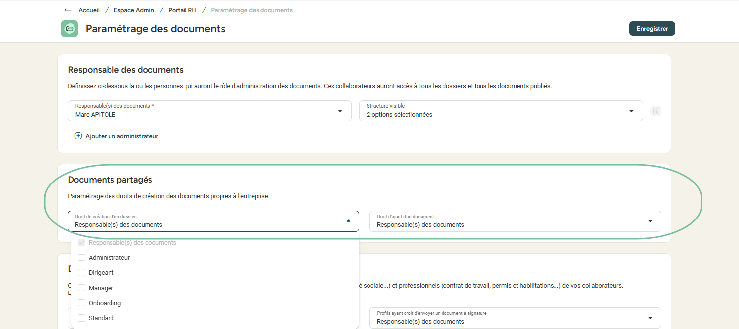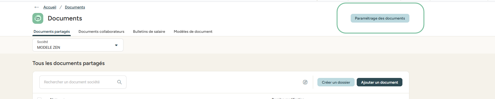 Portail RH > Documents > Onglet "Documents partagés" > paramétrage des documents" :