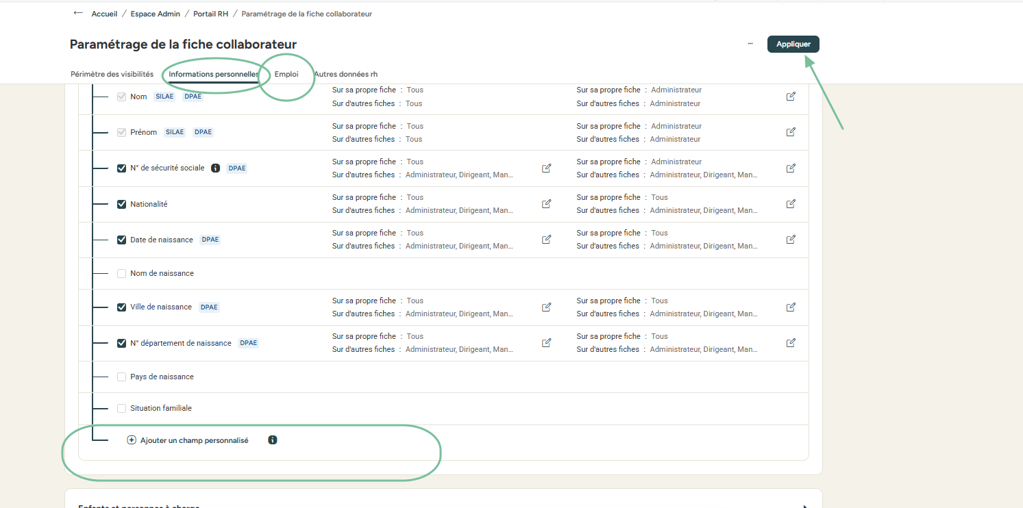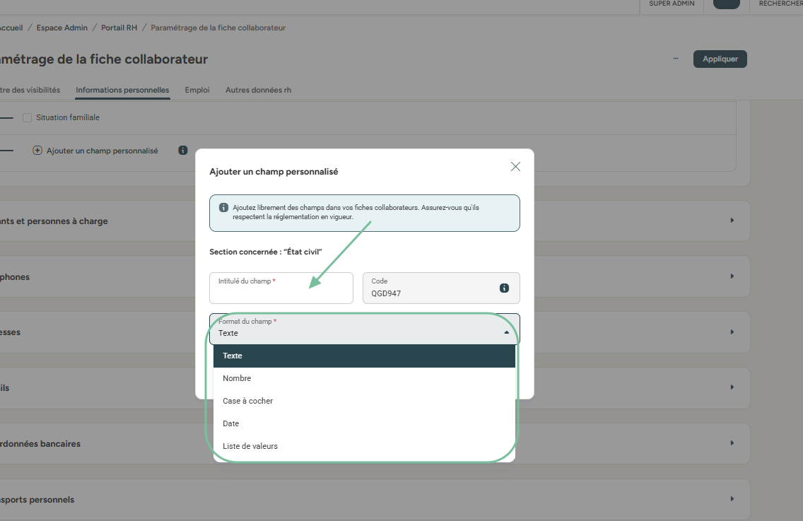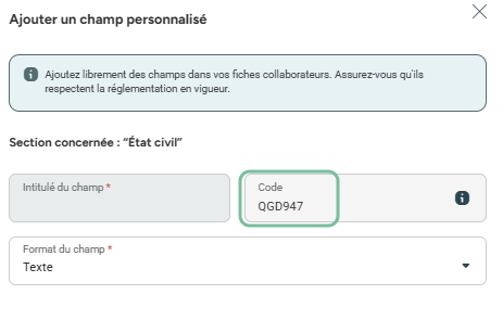 créer un nouveau champ personnalisé dans une section de la fiche collaborateur