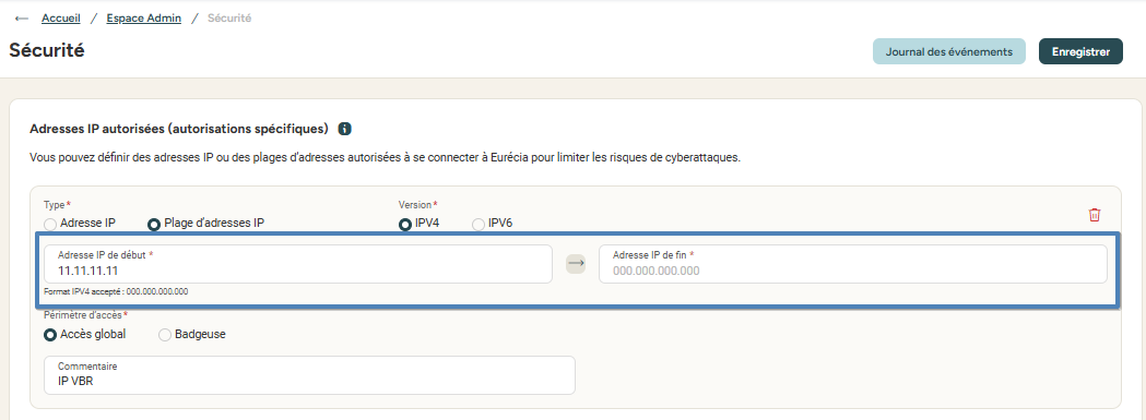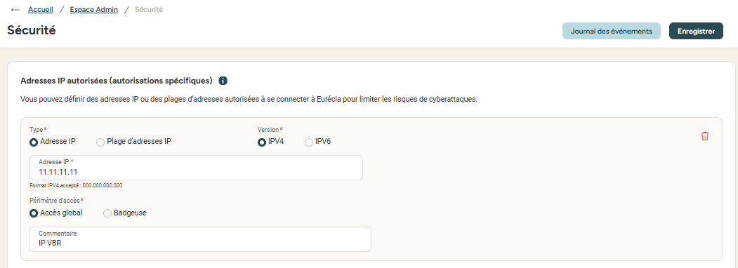 - « Accès global » permet de n’autoriser l’accès à la plateforme Eurécia que via cette ou ces adresses IP. Si l’utilisateur n’a pas l’adresse IP indiquée, il ne pourra pas se connecter au logiciel.